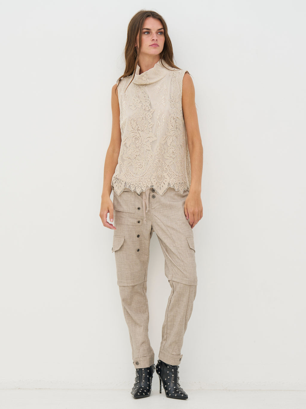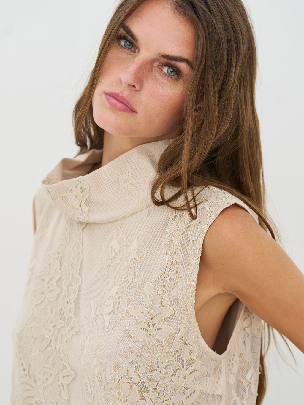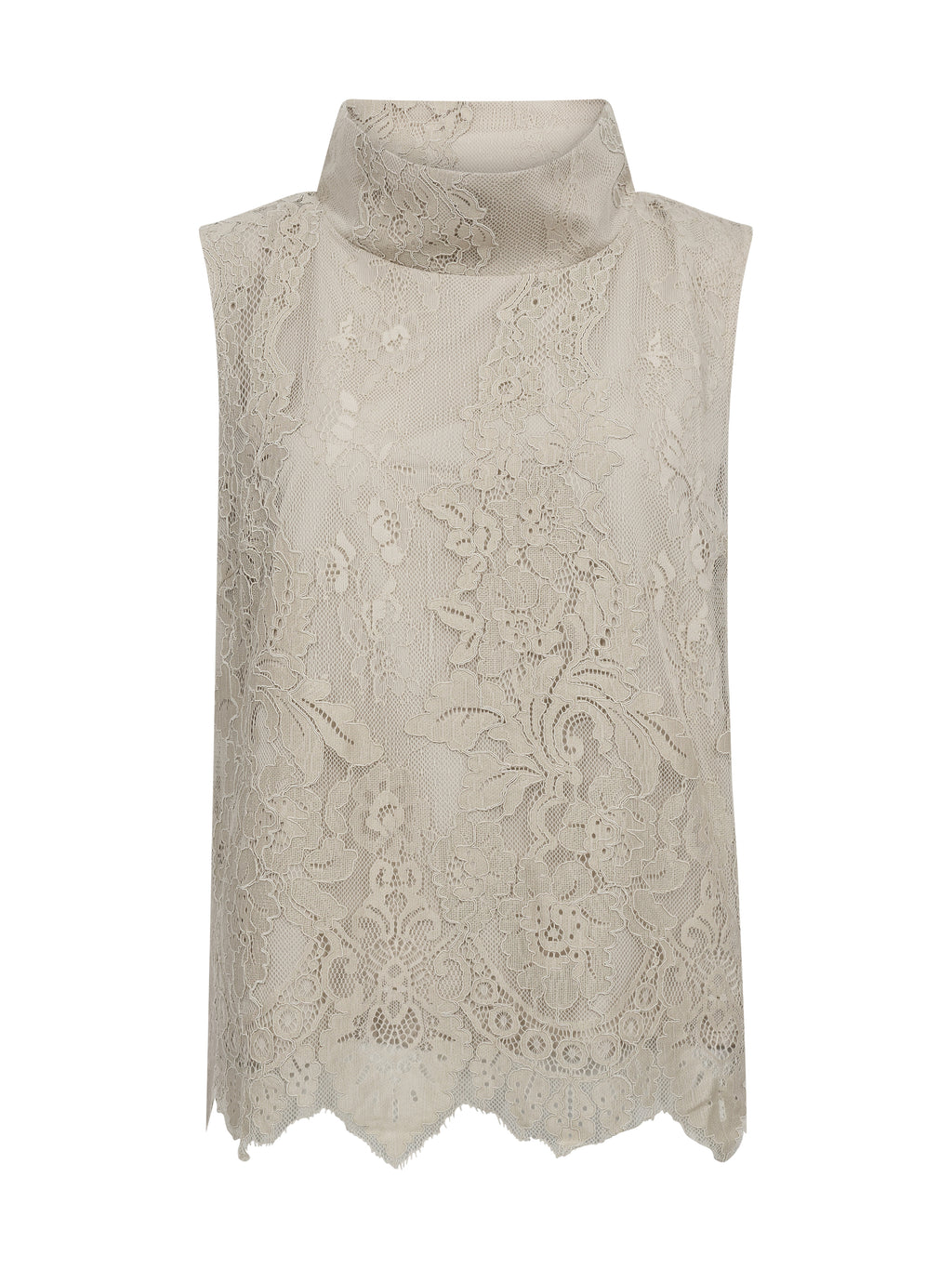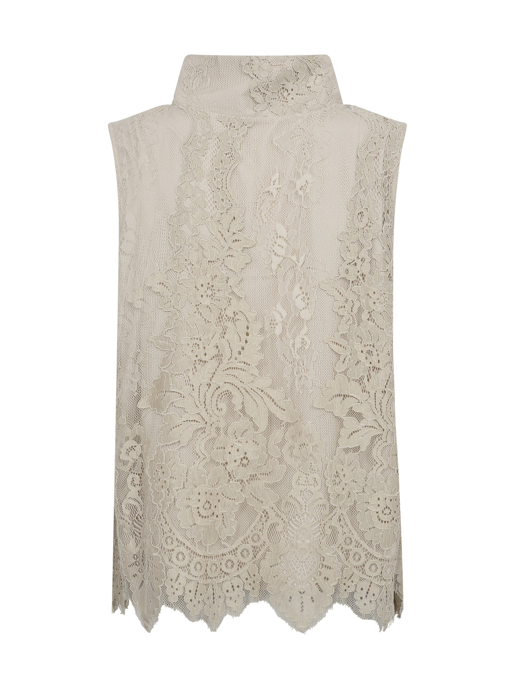 Denne top er lavet i blondestof og har et feminint udtryk med høj hals og ærmeløst snit. Blonden giver et fint spil i overfladen, mens kanten forneden er let bølget og afslutter designet på en pæn måde. Foran og bagpå er udtrykket ensartet, så toppen falder roligt og let omkring kroppen. Den er nem at style både til hverdag og mere festlige anledninger. Style toppen med et par bukser, nederdel eller under en jakke eller blazer.