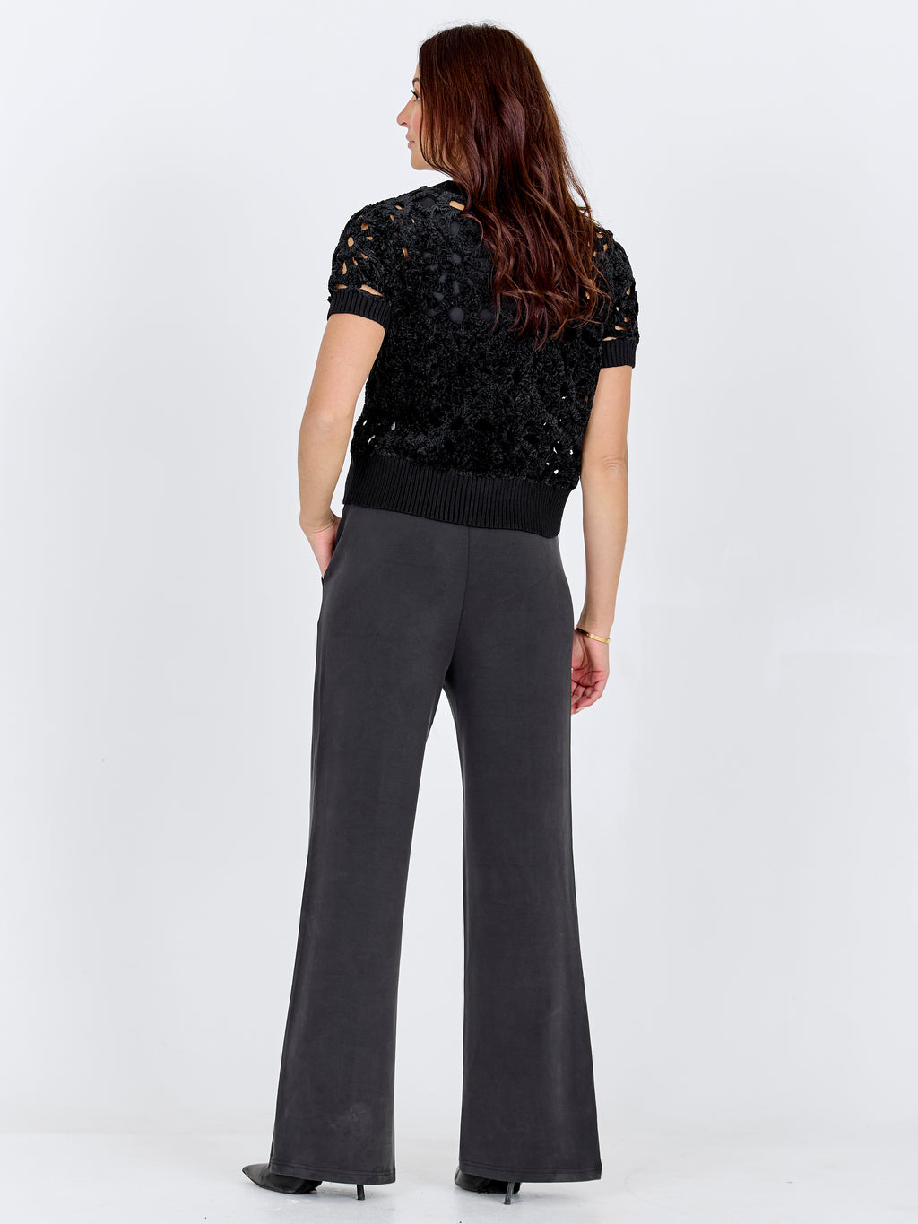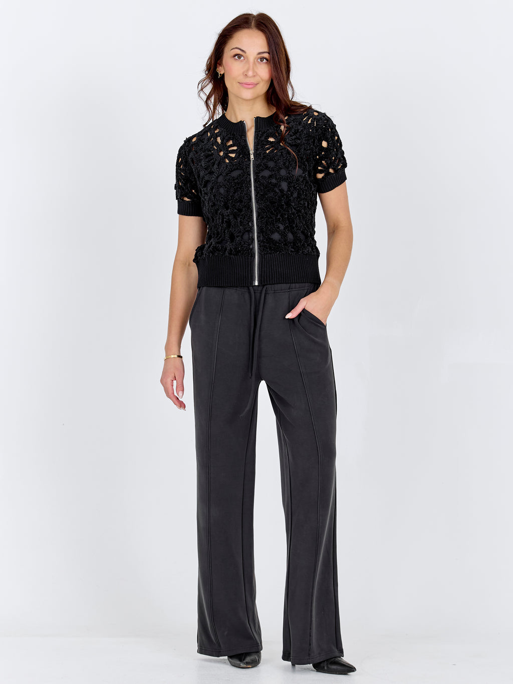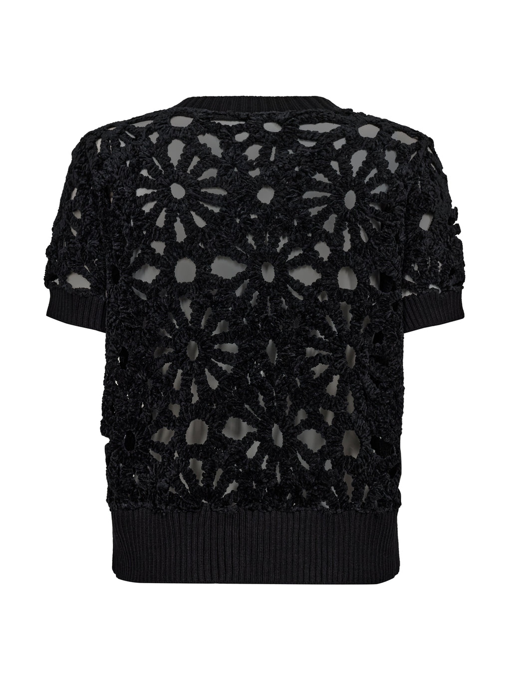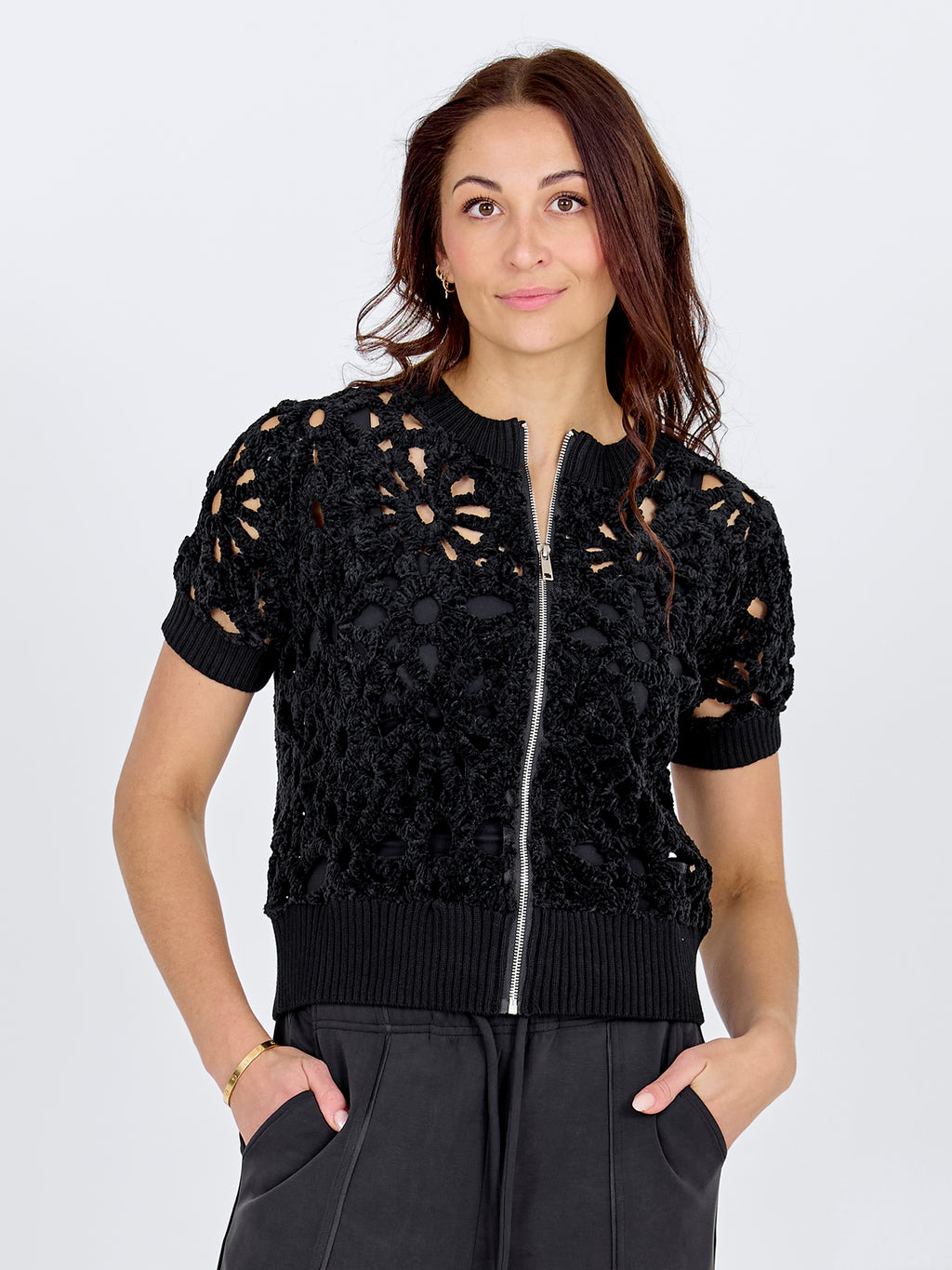 Denne korte jakke/cardigan har et blomstret hulmønster, som giver et let og dekorativt udtryk. Den lukkes med en gennemgående lynlås foran og har korte ærmer samt en enkel afslutning ved hals og bund. Bagsiden følger samme mønster og giver et roligt helhedsindtryk. Style den over en enkel top eller kjole, eller brug den sammen med løse bukser for et afslappet og anvendeligt hverdagslook.