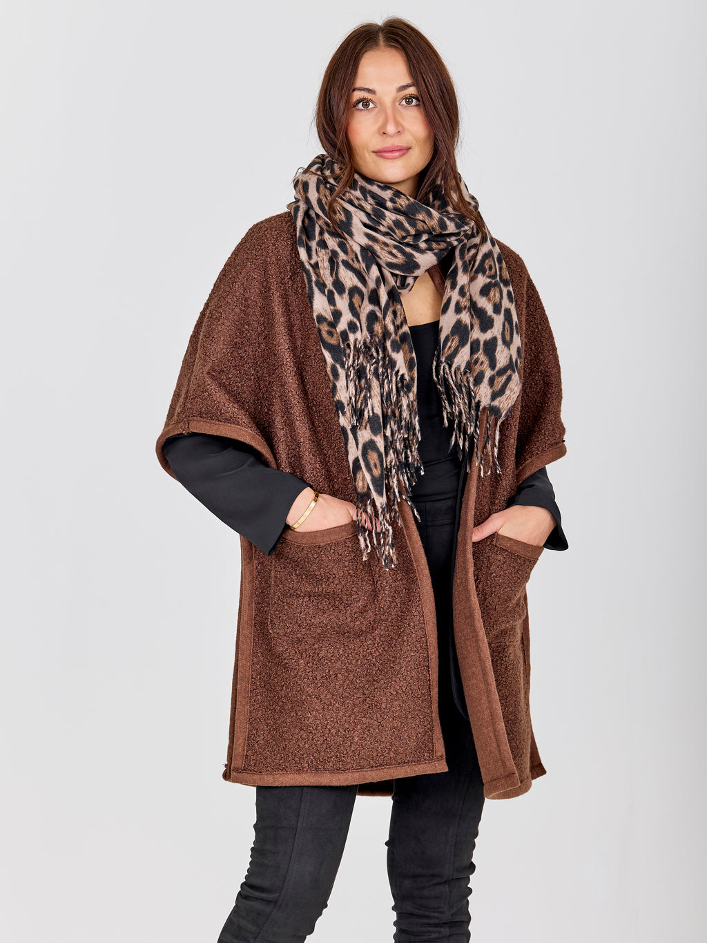 Et iøjnefaldende tørklæde med leopardmønster, der tilføjer kant og karakter til ethvert outfit. Den glatte overflade føles behagelig mod huden, og de tætte frynser i enderne fuldender designet. Tørklædet har en god længde, der gør det nemt at style på forskellige måder – både løst hængende eller viklet tæt om halsen.