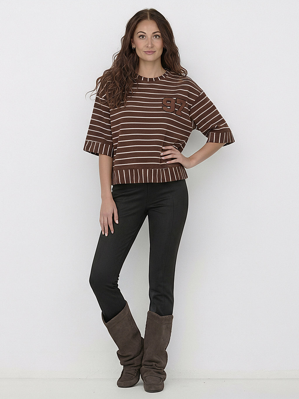 Denne stribede bluse har en afslappet pasform med rund halsudskæring og korte ærmer. Foran prydes den af et sporty “97”-print, der giver et ungdommeligt touch, mens den brede ribkant forneden og ved ærmerne tilfører struktur til designet. Den bløde kvalitet gør den behagelig at have på hele dagen.