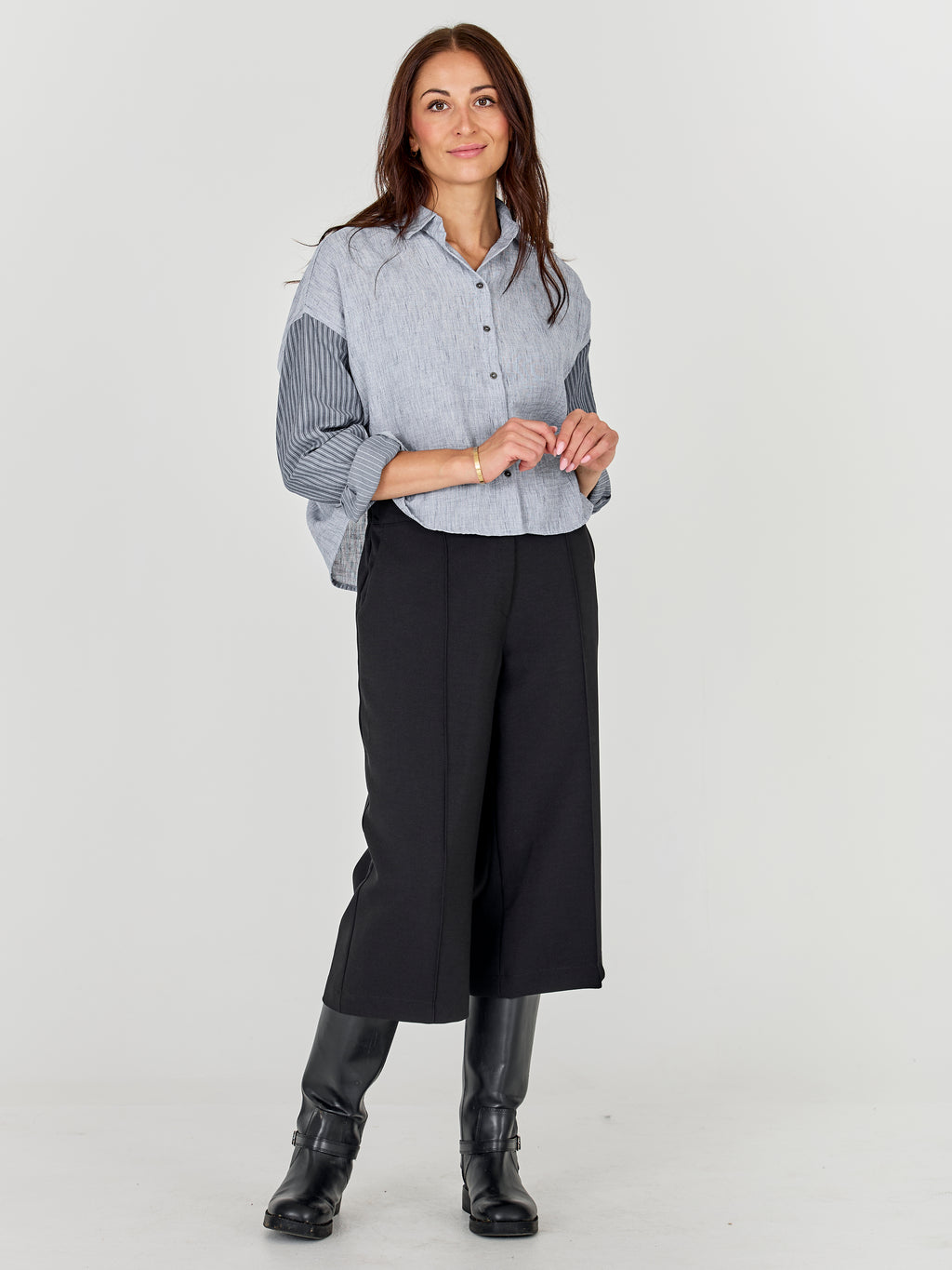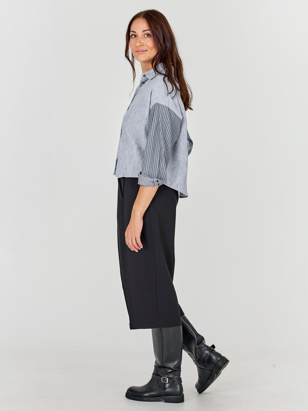 Denne skjorte har et enkelt udtryk med fine kontraster, der skaber et moderne twist. Den har en ensartet, meleret struktur, mens ærmerne har lodrette striber og brede manchetter med knaplukning. Skjorten lukkes med knapper hele vejen ned, og bagstykket følger det samme enkle design som fronten.