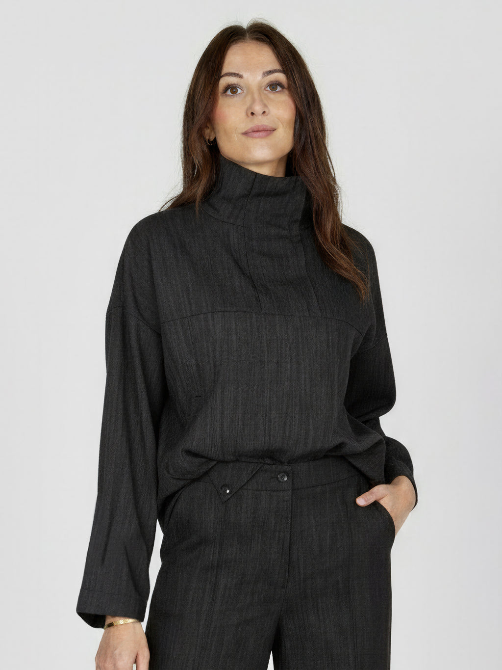 Denne overdel kombinerer et struktureret materiale med et enkelt, men raffineret design. Den har høj krave med kort lynlås, brede ærmer og et let boxy snit, som giver en afslappet og samtidig velklædt silhuet. Bagsiden følger samme enkle udtryk som fronten, hvilket gør den nem at style på tværs af sæsoner.