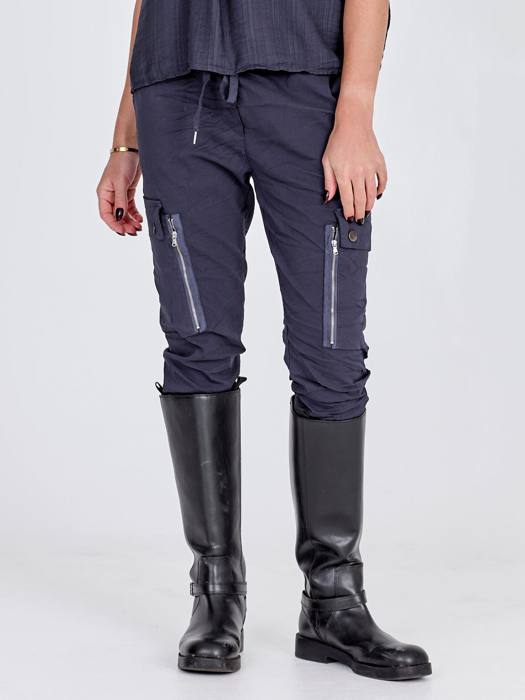Disse cool bukser er i en lækker bomuldskvalitet med masser af stretch. Bukserne har en let baggy pasform og en elastisk talje med bindebånd, der sørger for en fantastisk komfort. Midt på bukserne er der to store lommer med knapper samt en lang pyntelynlås, som giver en rå detalje.