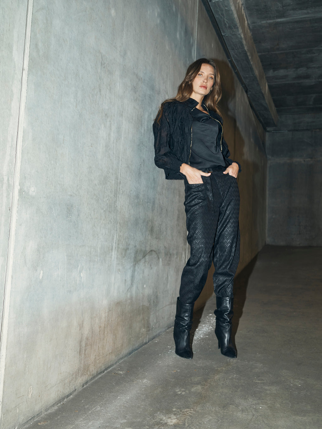 Tilføj et feminint twist til din garderobe med denne lette jakke med broderede blomster og smukke transparente detaljer. Jakken har høj krave, lynlås fortil og rynk ved skuldrene, som skaber et voluminøst udtryk. Den brede elastik ved hofte og ærmekanter giver jakken en flatterende form og komfortabel pasform.