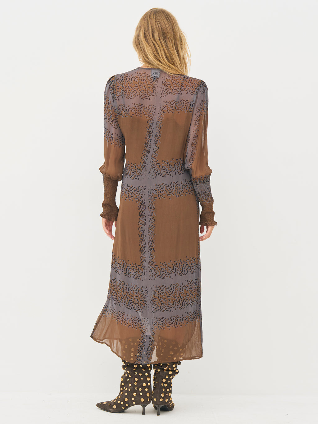 Denne kjole forener lethed og struktur med sit delikate, transparente materiale og det grafiske mønster. Den har slå-om-effekt med bindebånd i taljen og lange ærmer med smock og fine flæsekanter, som tilfører en feminin detalje. Den medfølgende underkjole sikrer behagelig dækning.