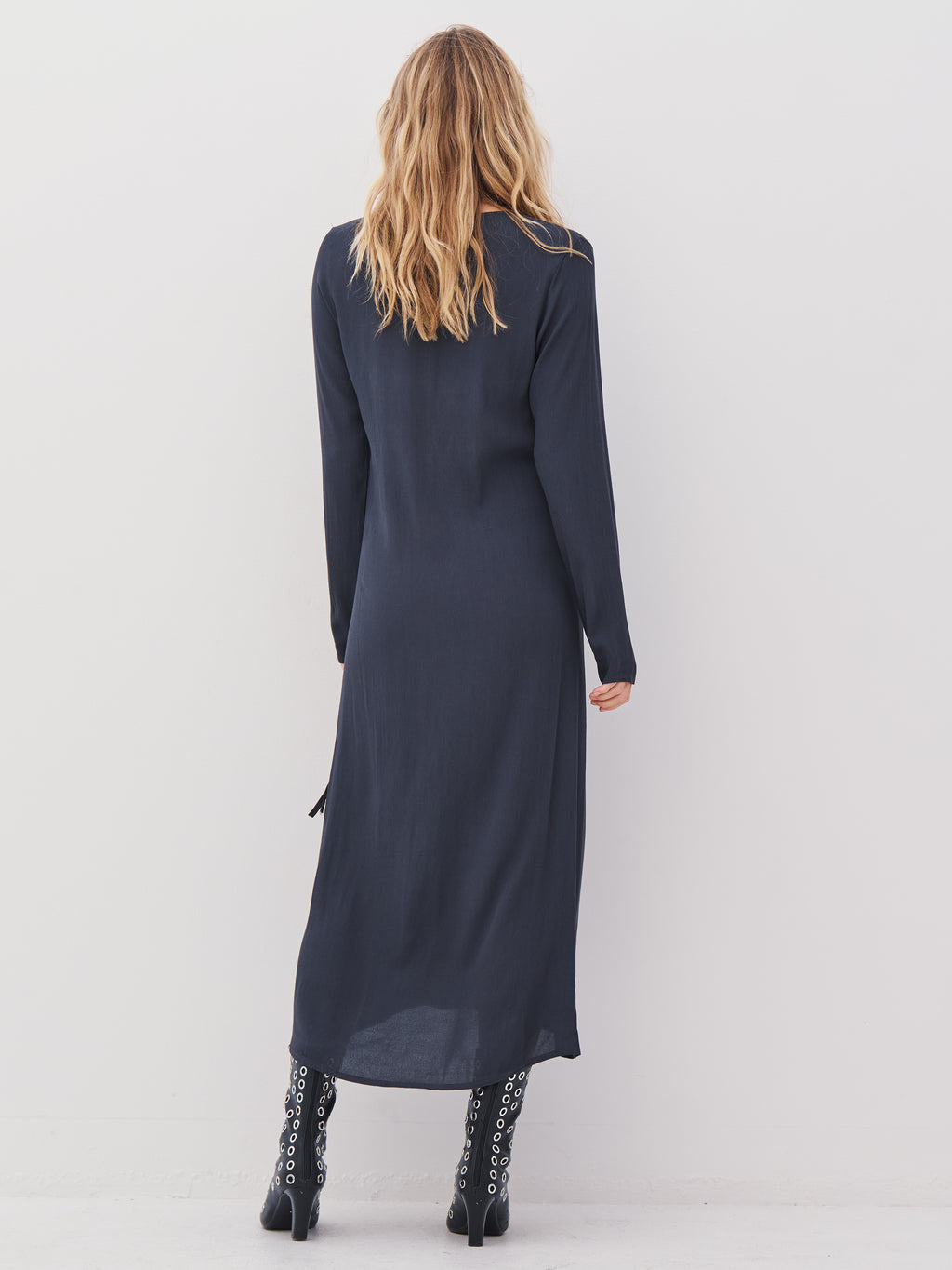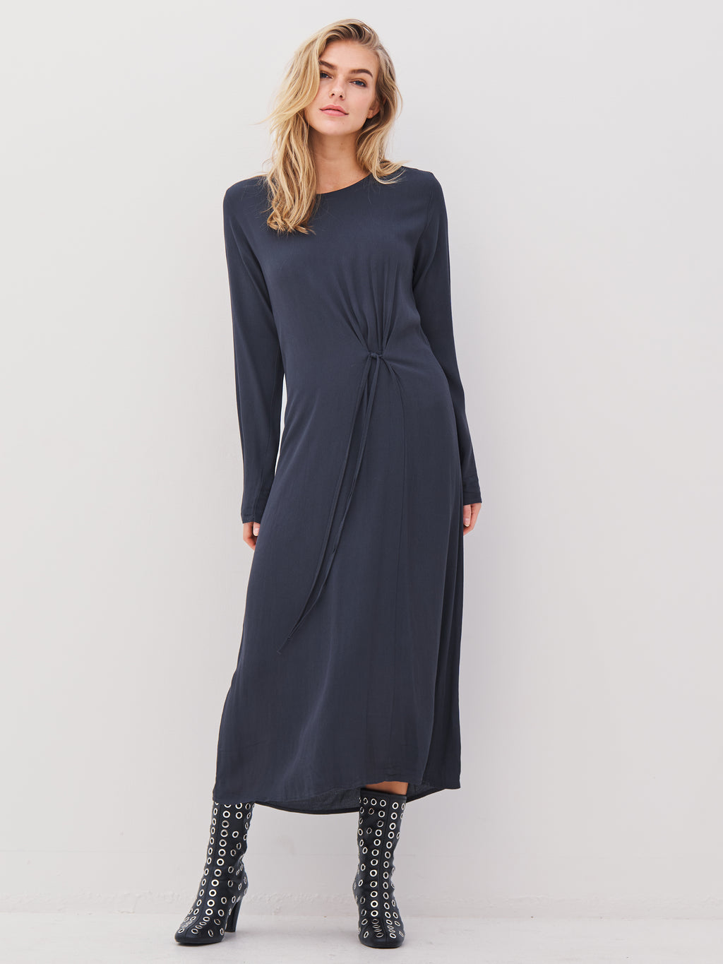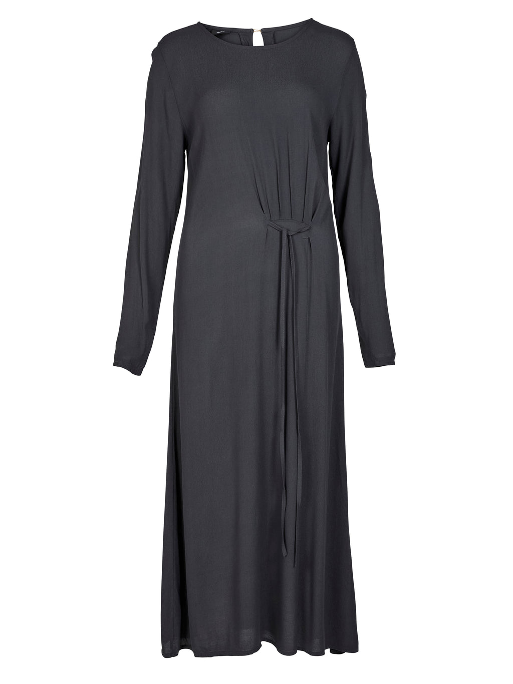 Denne lange kjole har et enkelt og elegant udtryk med rund hals og lange ærmer. En diskret bindedetalje i taljen fremhæver figuren og skaber en flatterende silhuet. Stoffet falder let og giver kjolen et roligt og flydende udtryk. Bagpå lukkes den med en lille knap i nakken, som tilføjer en fin detalje.