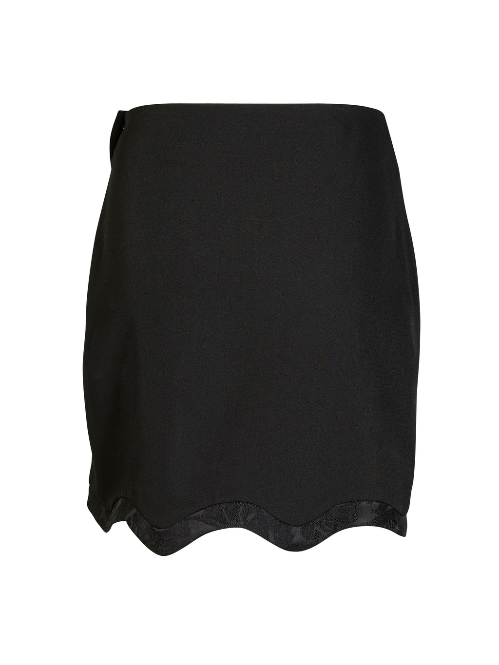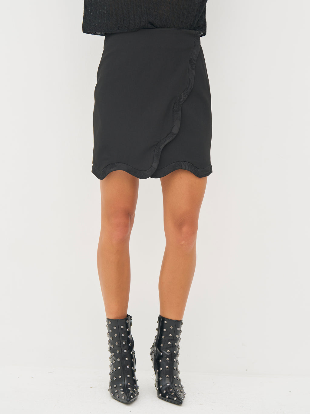 Denne elegante nederdel har et enkelt og feminint udtryk med sit slå-om design og bølgede kant. Den lukkes diskret med knapper i venstre side, som også tilføjer en dekorativ detalje. En blank kant med let struktur fremhæver silhouetten og giver nederdelen et sofistikeret touch.
