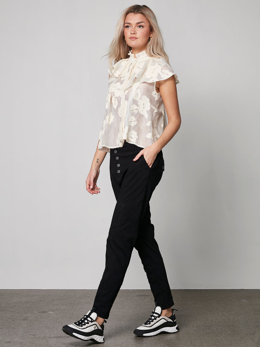 Disse bukser er perfekte til både formelle og afslappede begivenheder. For et sofistikeret hverdagslook, prøv at kombinere dem med en skjorte og enkelte smykker. Buksernes sidelommer giver dem et praktisk touch, mens den unikke knaplukning foran tilføjer et moderne twist.