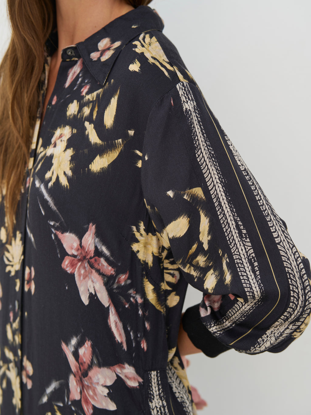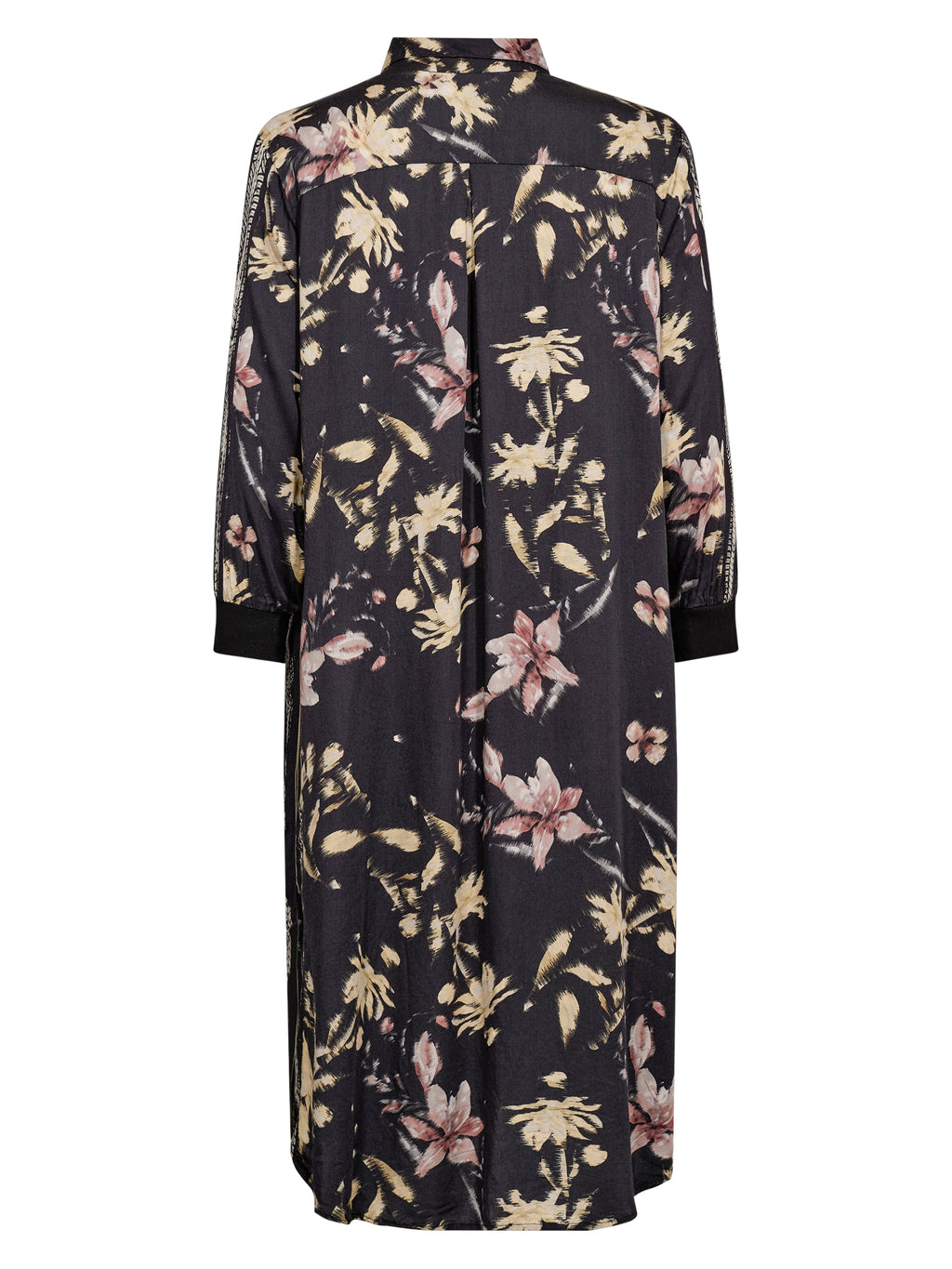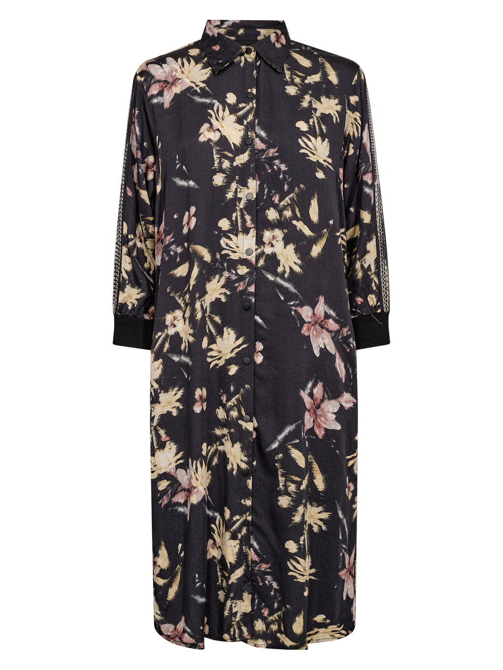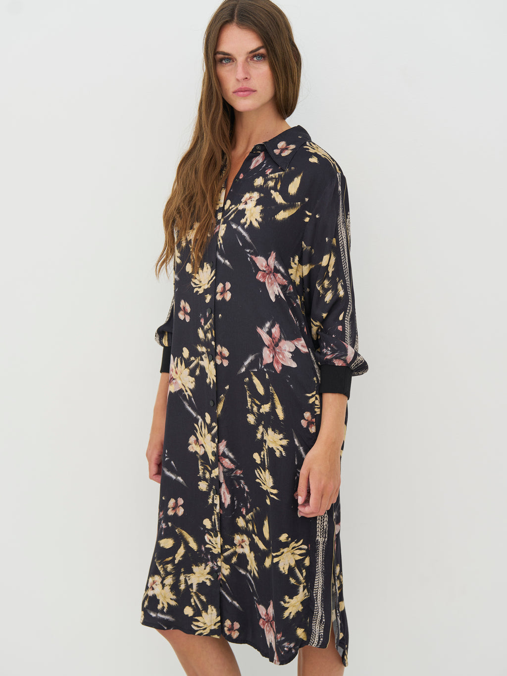 Denne kjole har et afslappet og anvendeligt udtryk med gennemgående knaplukning og klassisk krave. Printet giver kjolen karakter, mens de lange ærmer med manchetter holder looket rent. I siderne er der slidser, som giver lidt ekstra bevægelse og gør den behagelig at have på. Bagsiden er enkel og falder lige ned. Brug kjolen alene eller åben over bukser og en top.