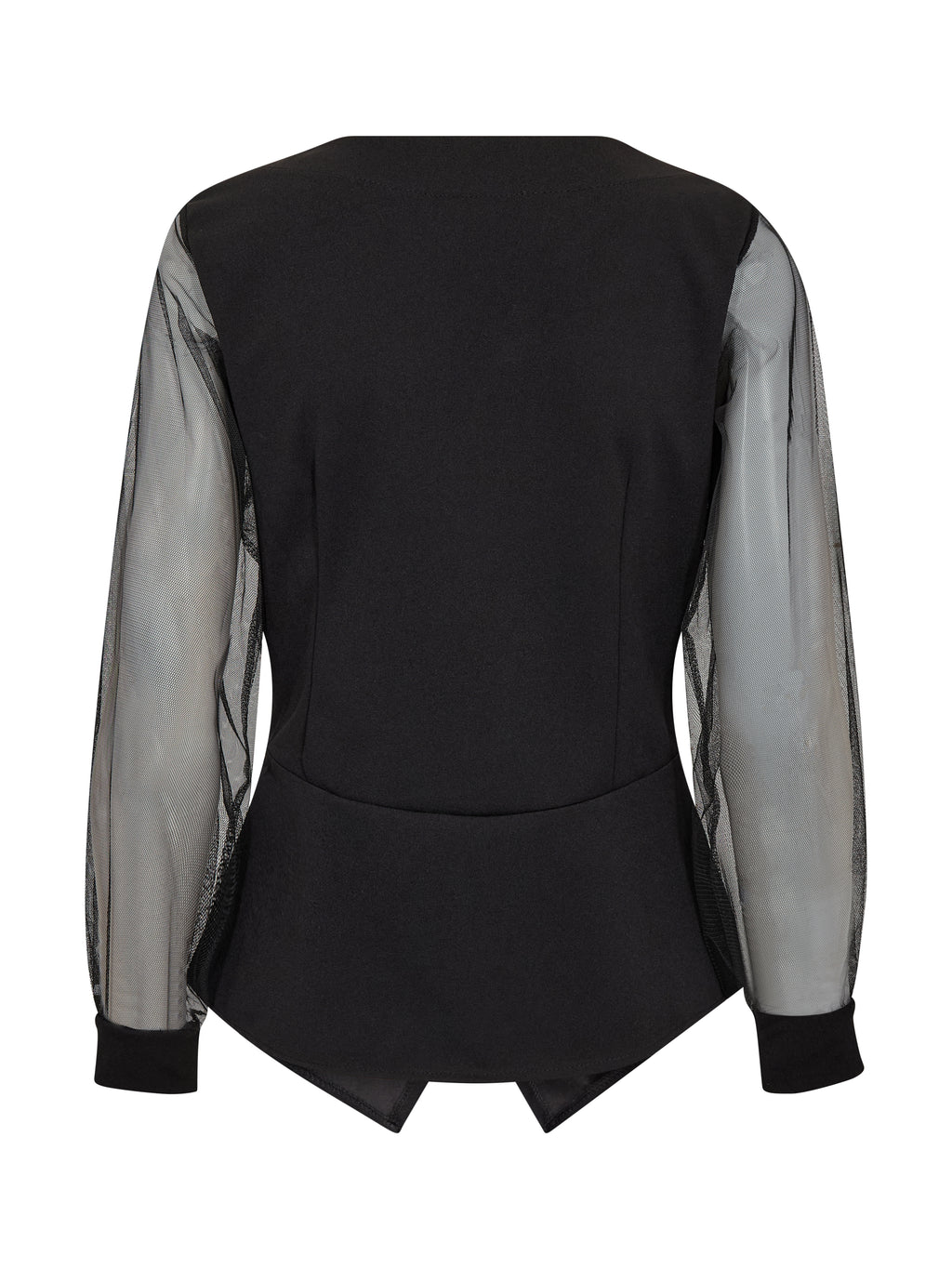 Blusen har et figursyet snit med smukke læg foran og en markeret talje, som giver en elegant silhuet. Den dybe V-udskæring og asymmetriske afslutning foran tilføjer et moderne udtryk, mens de lange meshærmer med cuffs skaber en let og fin kontrast. Bagsiden er enkel og følger kroppens form.
