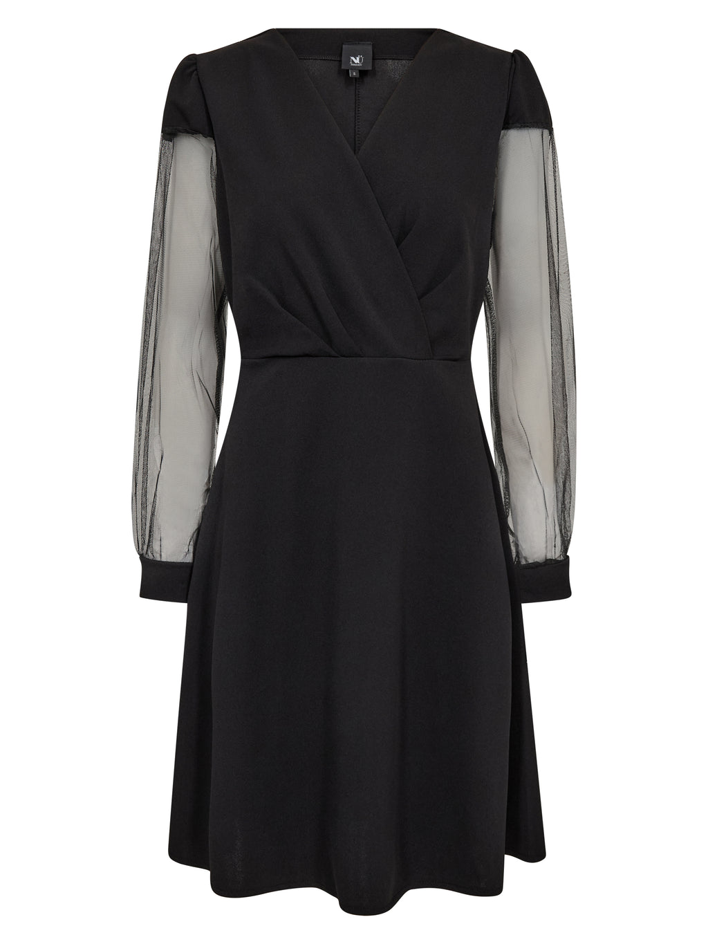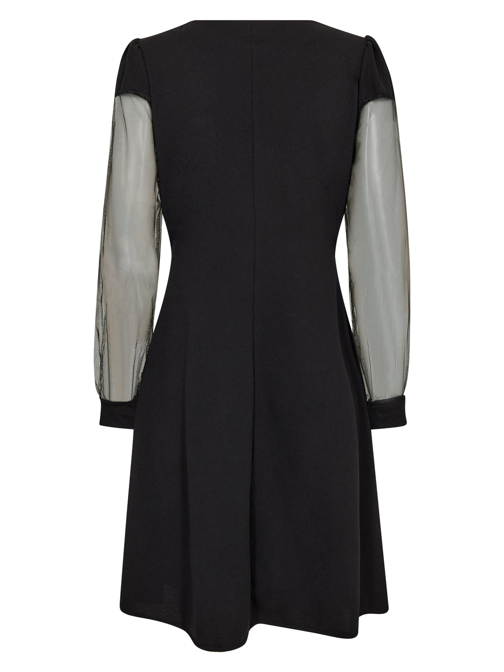 Kjolen har en elegant V-udskæring med bløde læg foran, som giver et feminint udtryk. Ærmerne er lavet i let, transparent mesh og afsluttes med faste cuffs, der tilføjer en fin kontrast til det enkle design. Skørtet har en let A-form og falder blødt omkring kroppen.