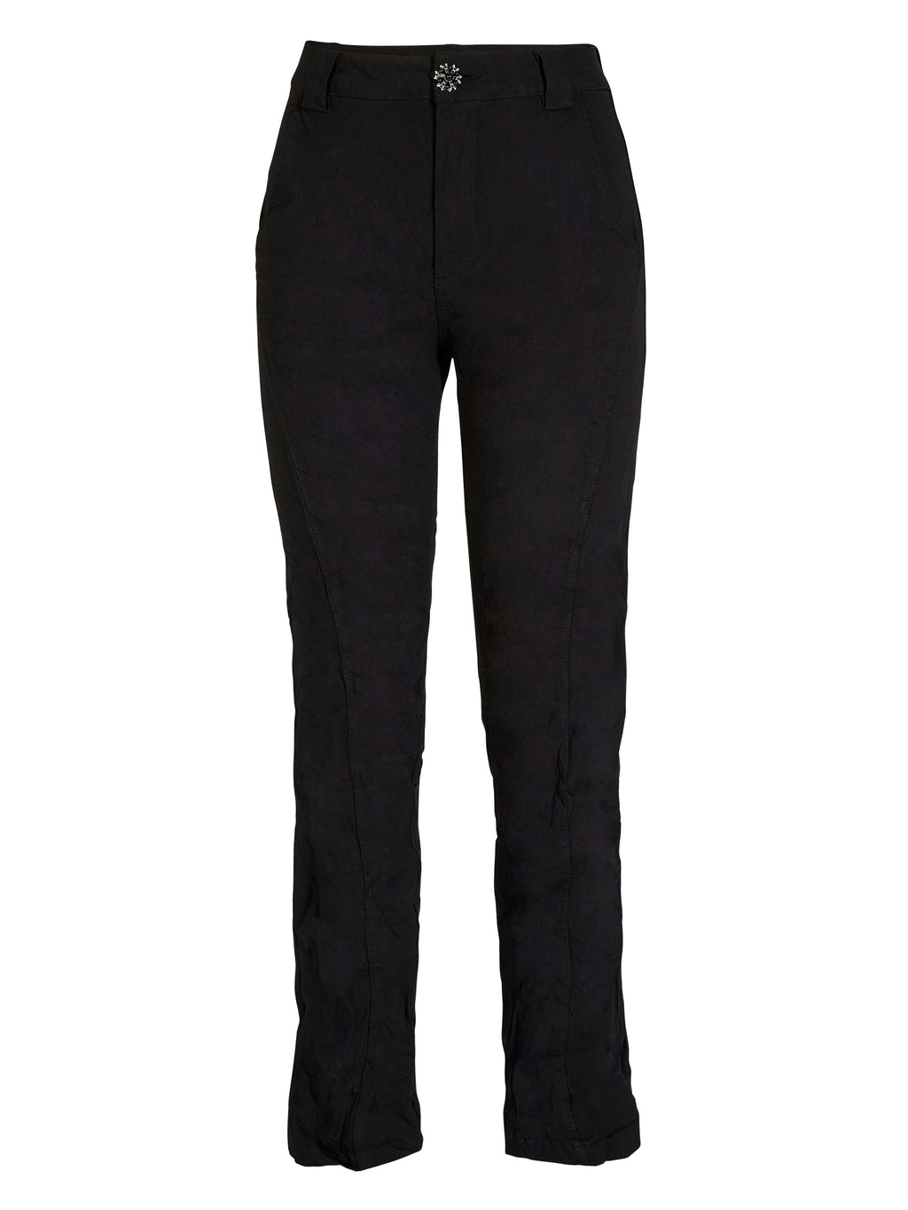 Disse bukser har et flatterende, lige snit og er designet i en let struktureret kvalitet, der giver et elegant udtryk. De dekorative knapper med glimmer foran og på baglommerne tilfører et eksklusivt touch. Sømføringerne ned langs benene giver en slankende effekt og understreger det stilrene look.