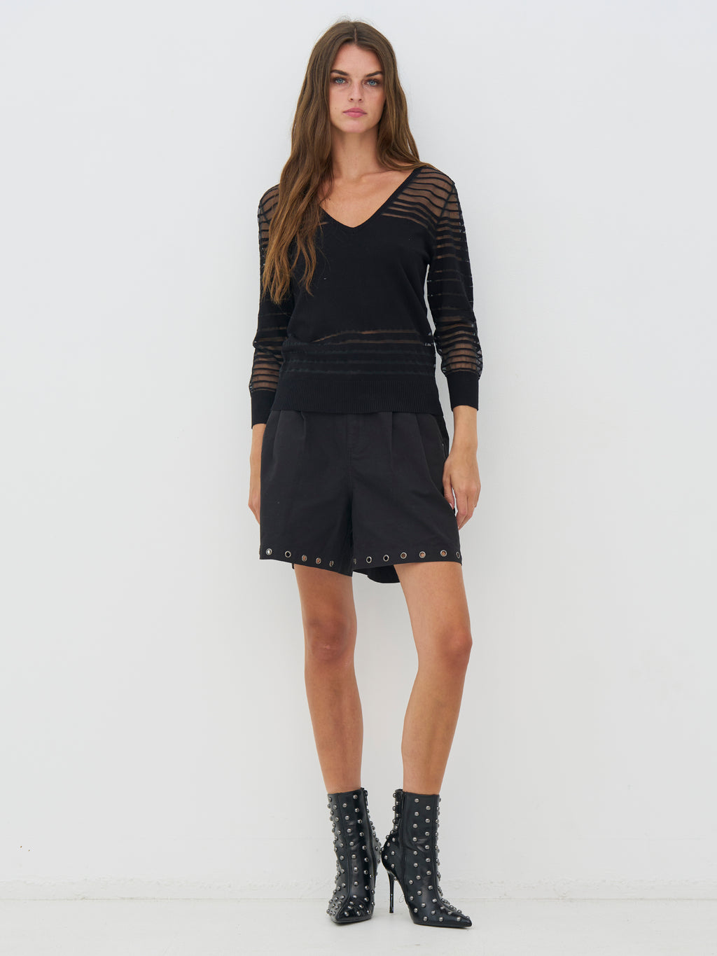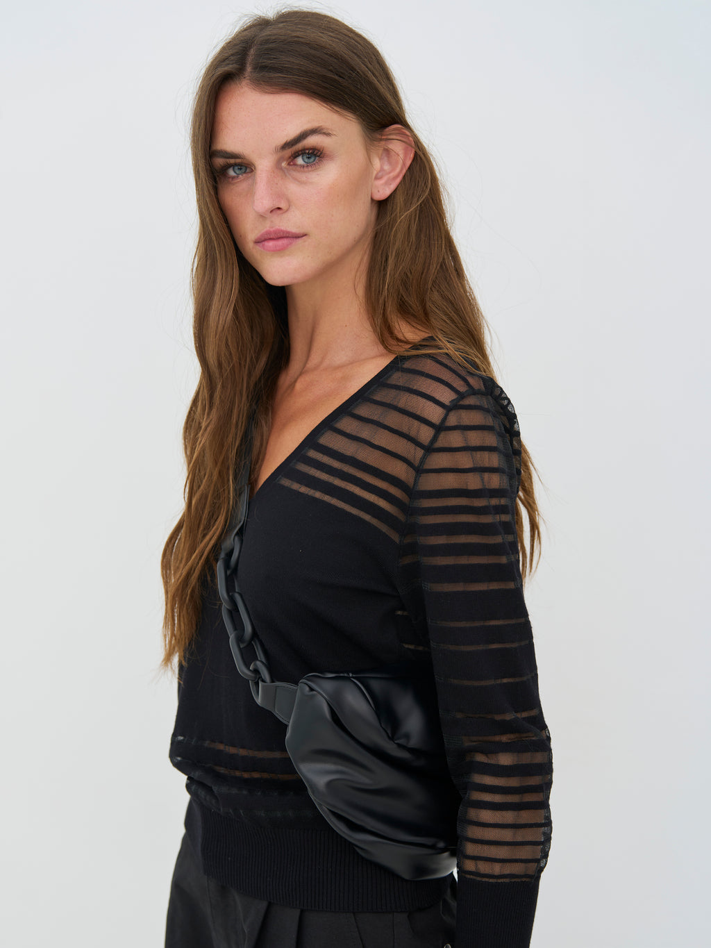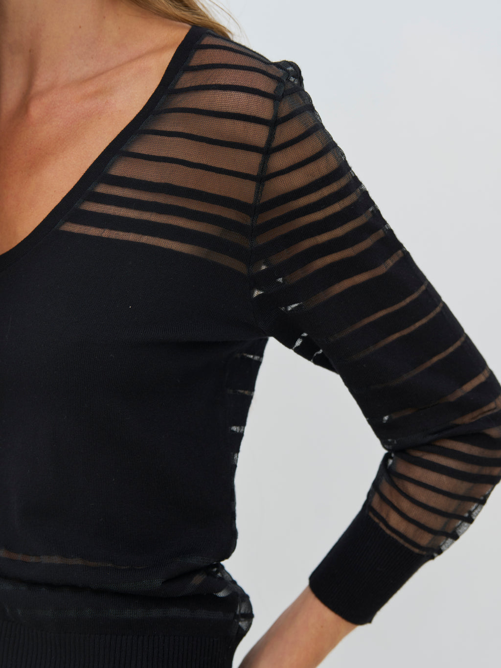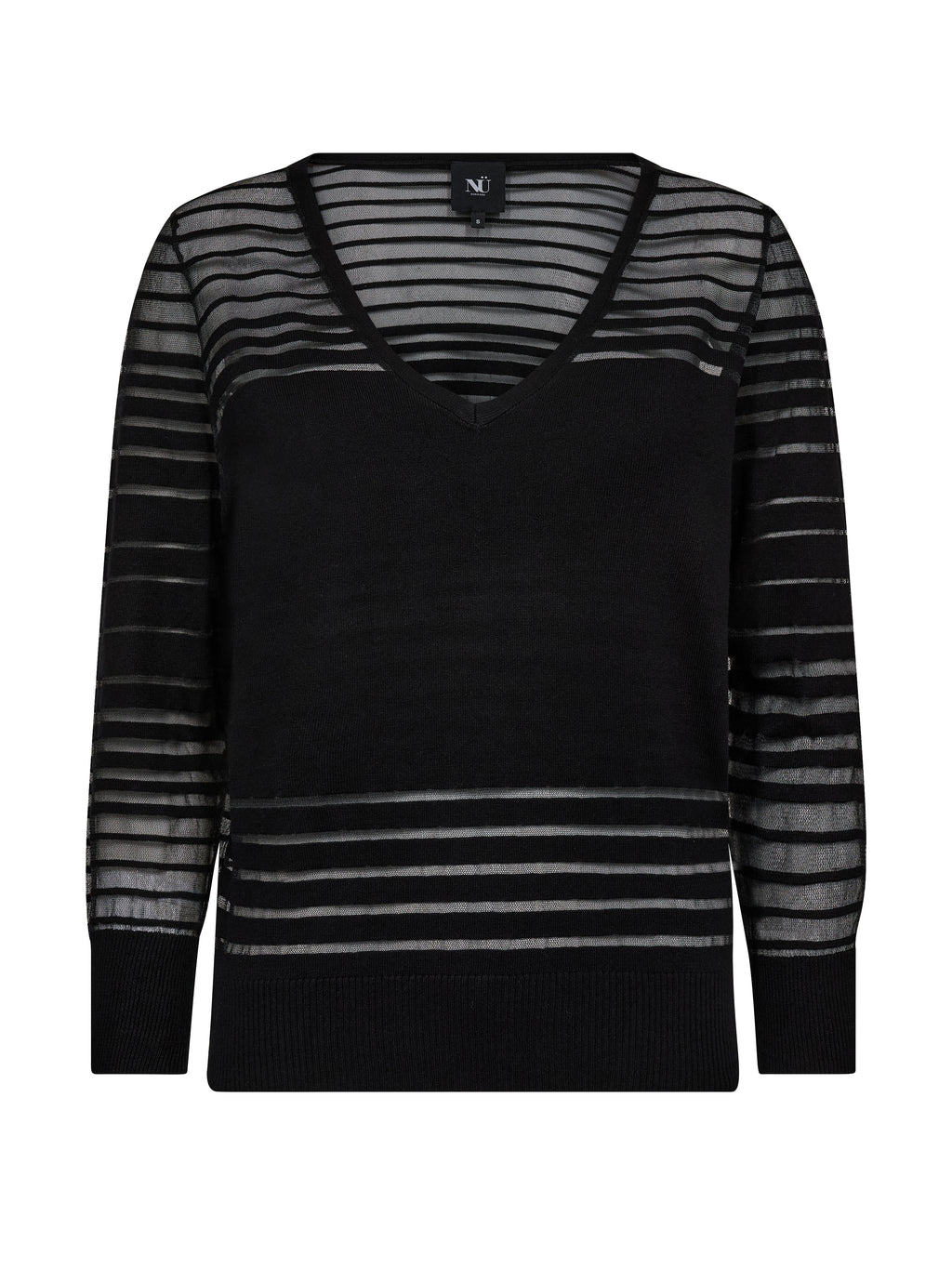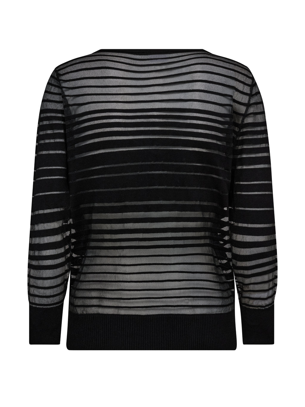 Denne bluse har et let og feminint udtryk med V-hals og lange ærmer i transparent kvalitet. De vandrette striber skaber spil i stoffet og giver blusen noget kant og karakter. Pasformen er lige og behagelig, og den fungerer fint både alene og sammen med en top under. En nem style, der kan bruges til både hverdag og aften.