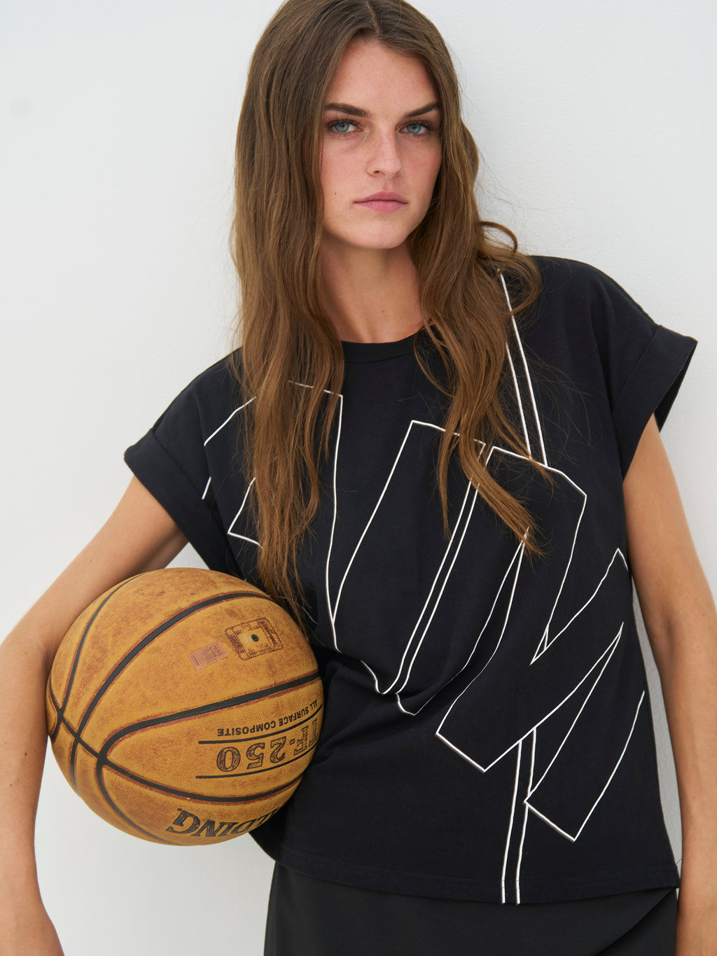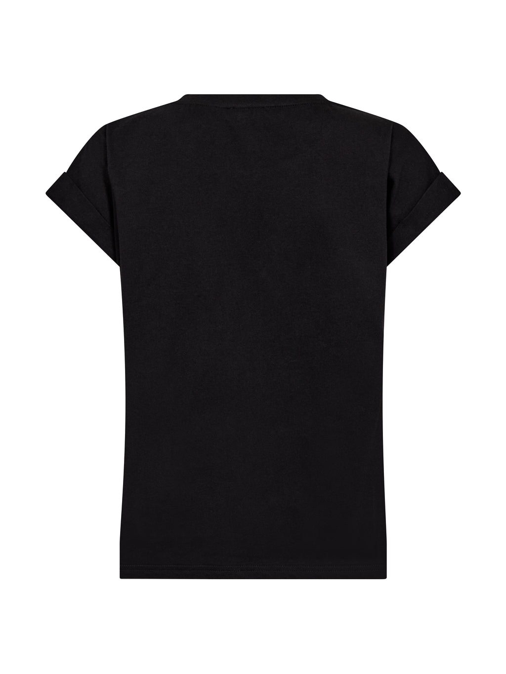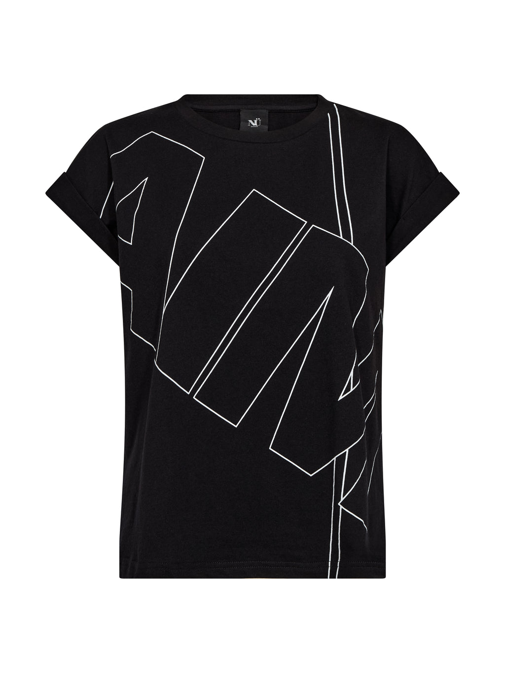Denne T-shirt har et enkelt og råt udtryk med rund hals og korte ærmer med let oprulning. Det hvide print på fronten giver et tydeligt visuelt udtryk, mens bagsiden er helt enkel og rolig. Pasformen er lige og behagelig, hvilket gør T-shirten nem at bruge i hverdagen. Brug den sammen med bukser eller nederdel for et afslappet look, eller style den under en blazer for et mere sammensat udtryk.