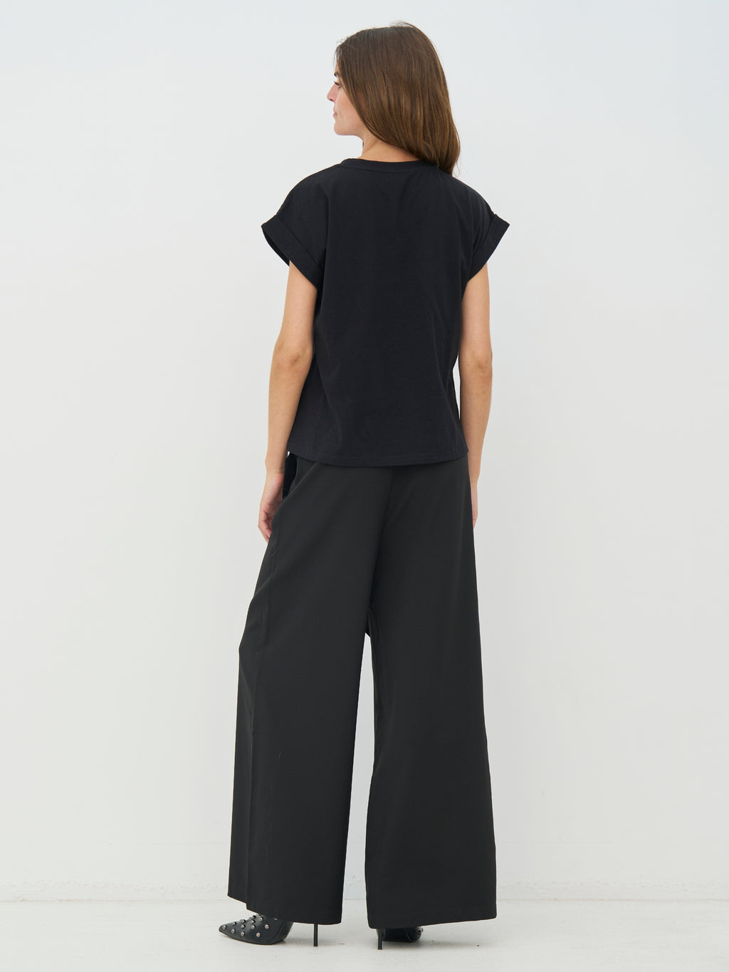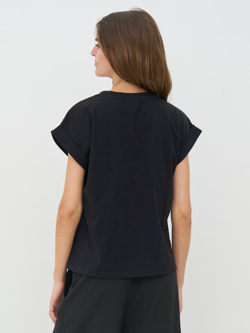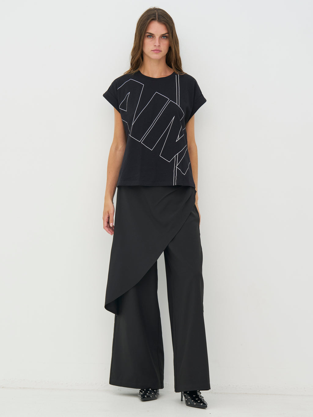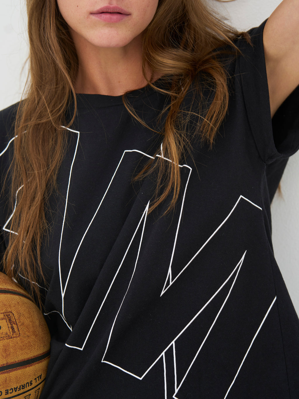 Denne T-shirt har et enkelt og råt udtryk med rund hals og korte ærmer med let oprulning. Det hvide print på fronten giver et tydeligt visuelt udtryk, mens bagsiden er helt enkel og rolig. Pasformen er lige og behagelig, hvilket gør T-shirten nem at bruge i hverdagen. Brug den sammen med bukser eller nederdel for et afslappet look, eller style den under en blazer for et mere sammensat udtryk.