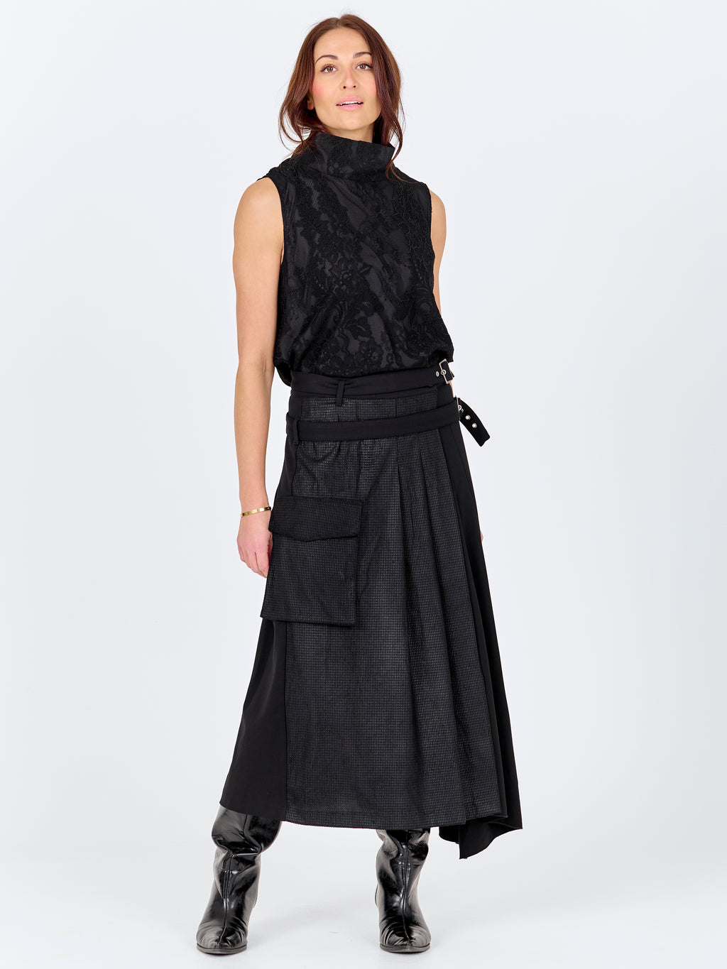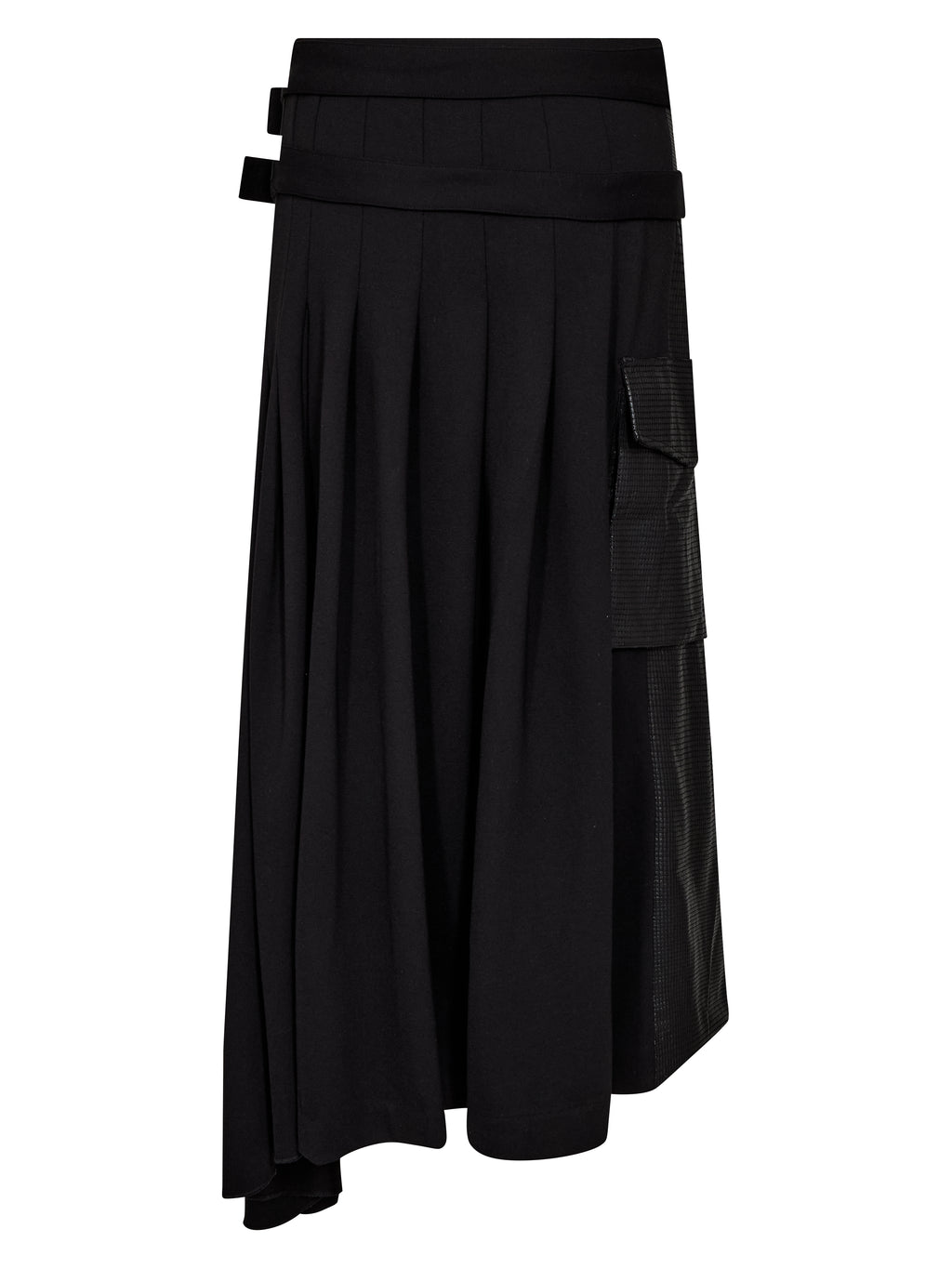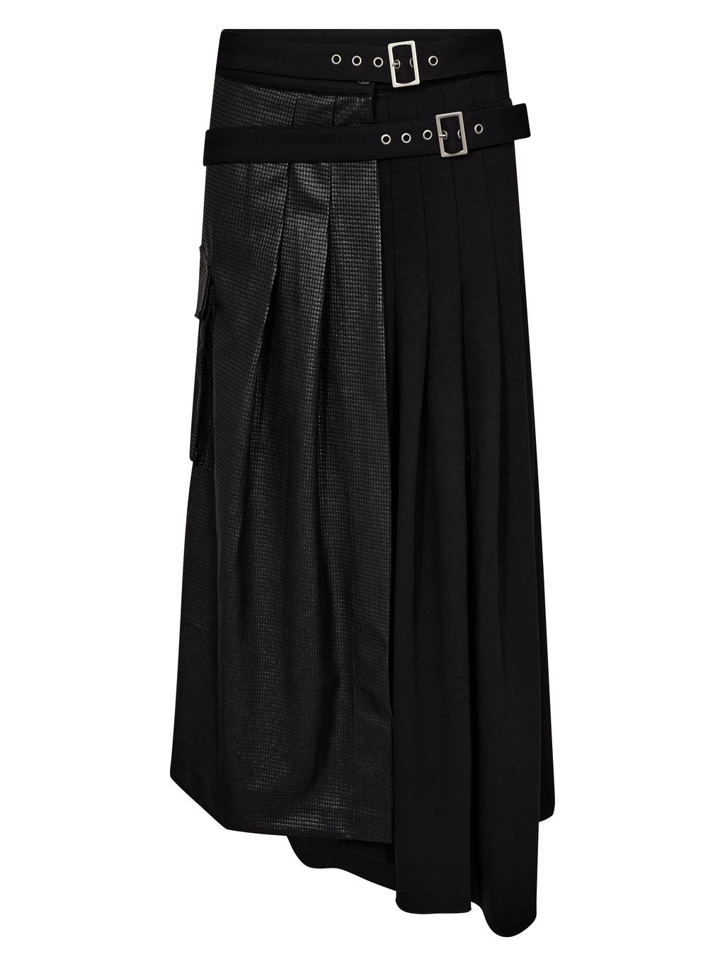 Denne nederdel har et markant og moderne udtryk med en kombination af plisseringer og kontrasterende materialer, der giver masser af karakter. Fronten er delt i to, hvor den ene side er mere glat, mens den anden har struktur og læg, som skaber bevægelse. Taljen afsluttes med justerbare spænder, der både er funktionelle og tilfører et råt touch. Bagsiden falder roligt og balancerer designet. Style nederdelen med en enkel top eller strik for et cool og gennemtænkt hverdagslook.