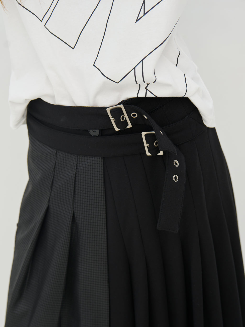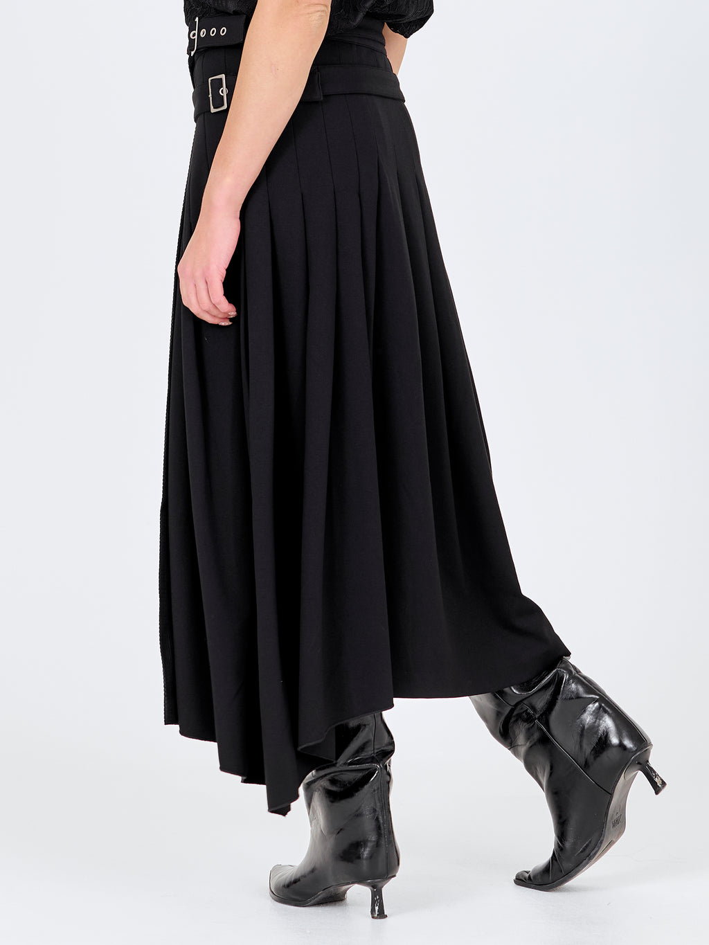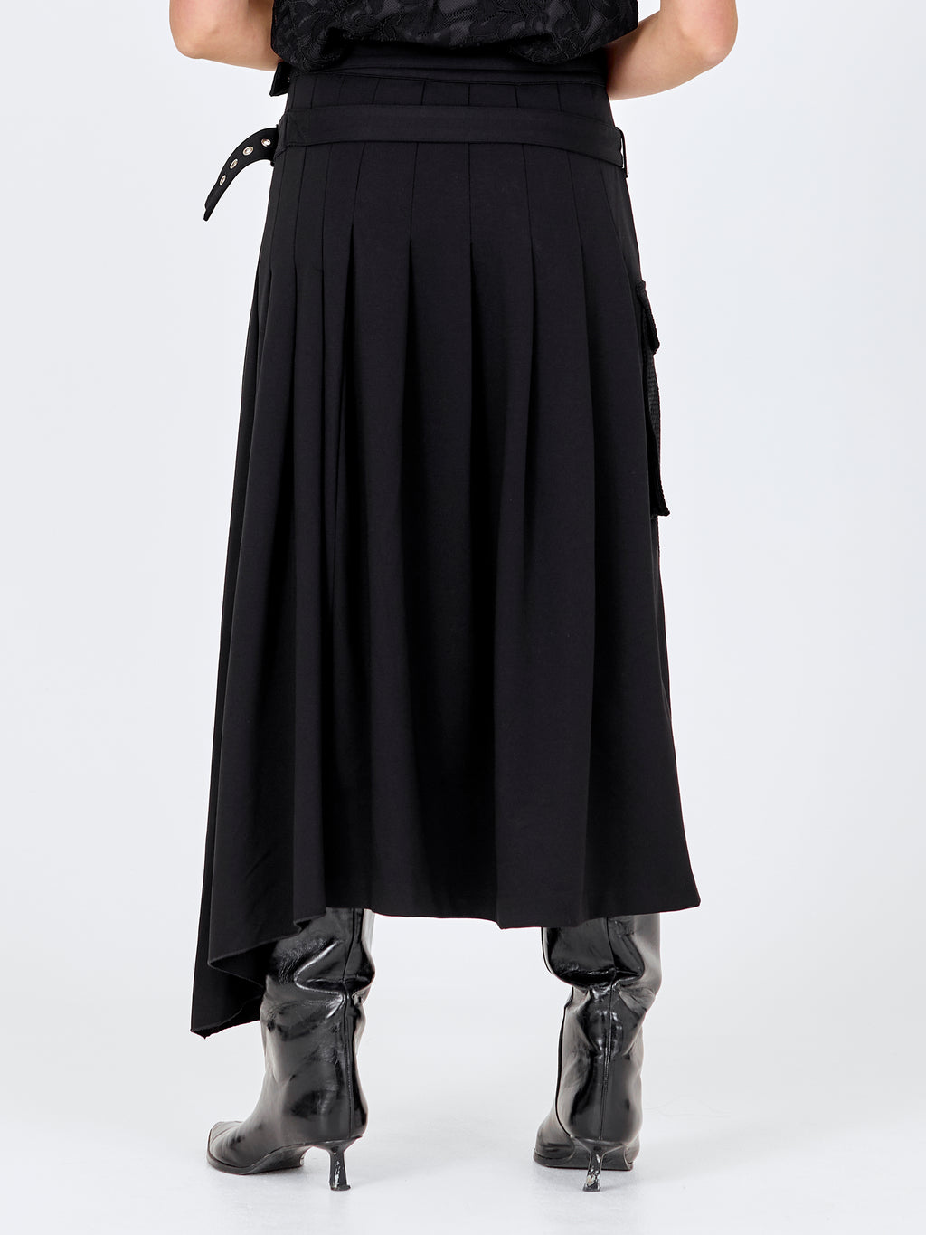Denne nederdel har et markant og moderne udtryk med en kombination af plisseringer og kontrasterende materialer, der giver masser af karakter. Fronten er delt i to, hvor den ene side er mere glat, mens den anden har struktur og læg, som skaber bevægelse. Taljen afsluttes med justerbare spænder, der både er funktionelle og tilfører et råt touch. Bagsiden falder roligt og balancerer designet. Style nederdelen med en enkel top eller strik for et cool og gennemtænkt hverdagslook.