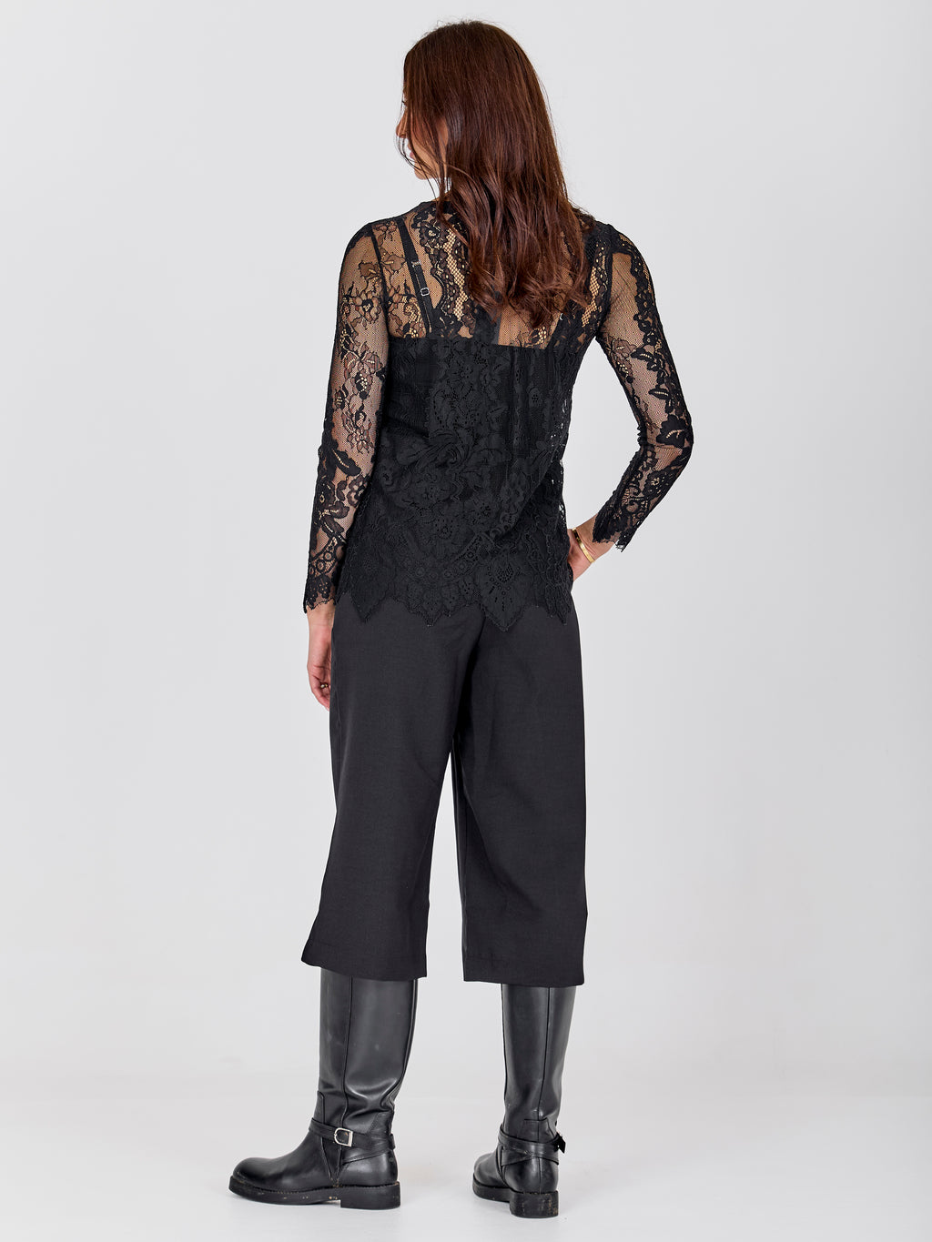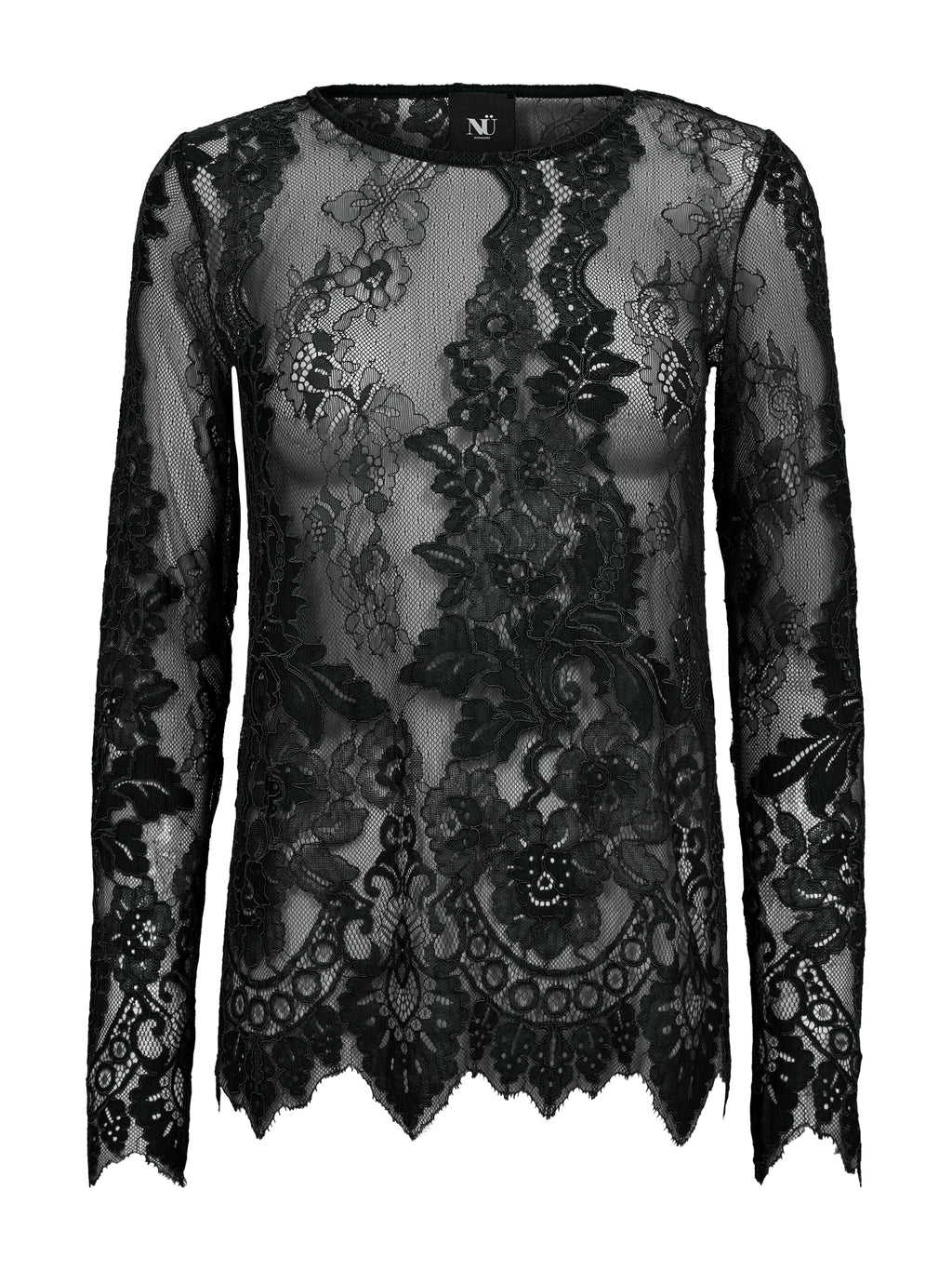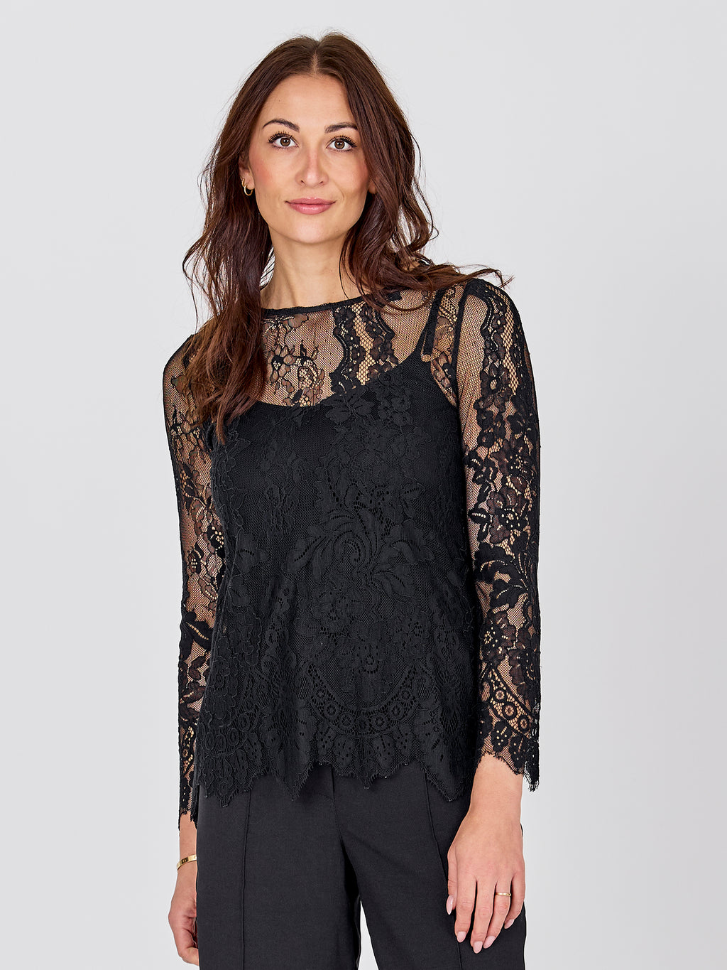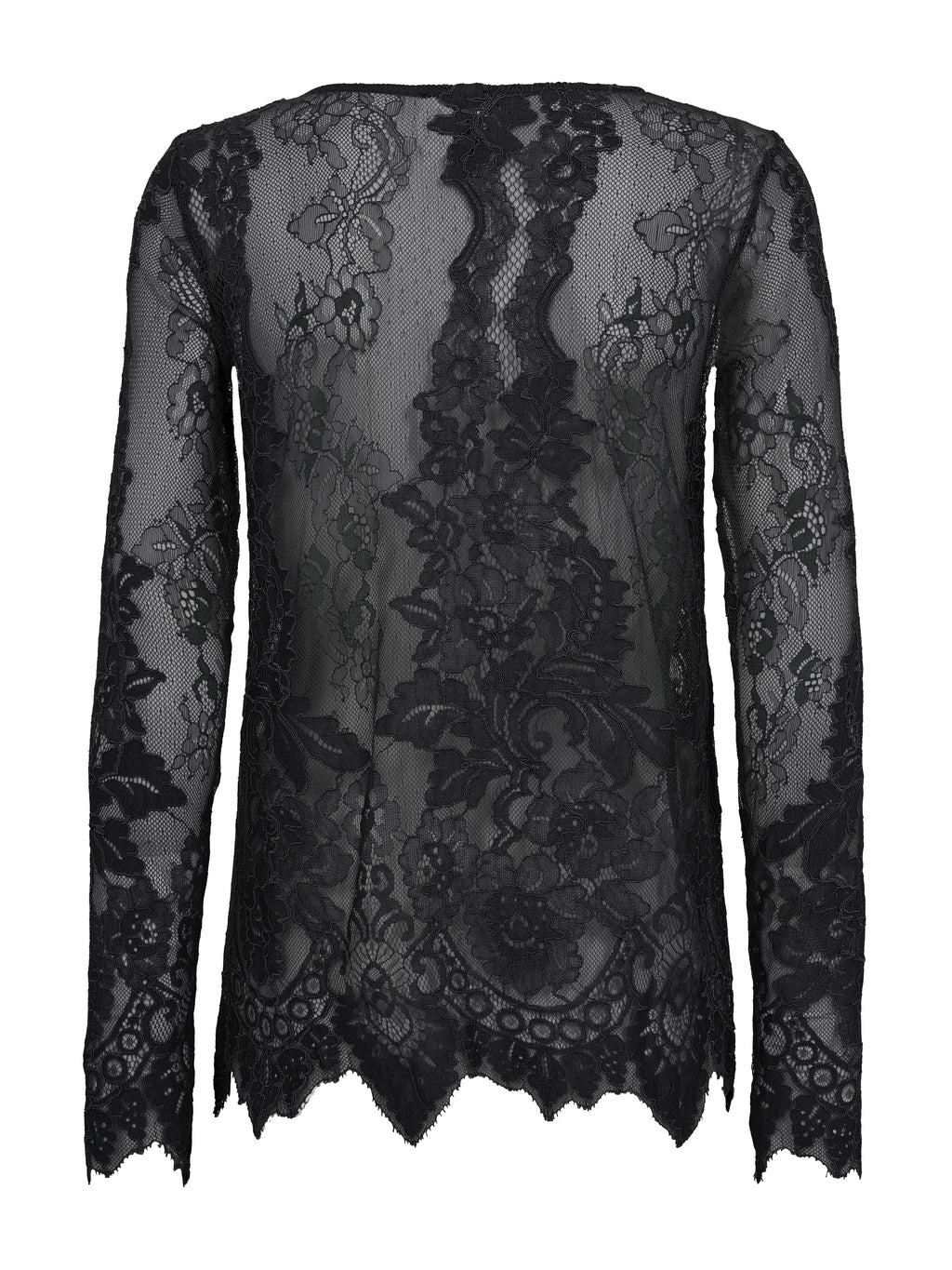 Denne blondebluse har et feminint og elegant udtryk med gennemsigtig blonde og et tydeligt blomstret mønster. Det lette materiale giver dybde i looket og fungerer smukt som lag over en enkel top. Kanterne er afsluttet med en let bølget kant, som giver et pænt og gennemført finish. Blusen er behagelig at have på og kan styles både til hverdag og mere festlige anledninger – alene eller under en blazer eller strik.