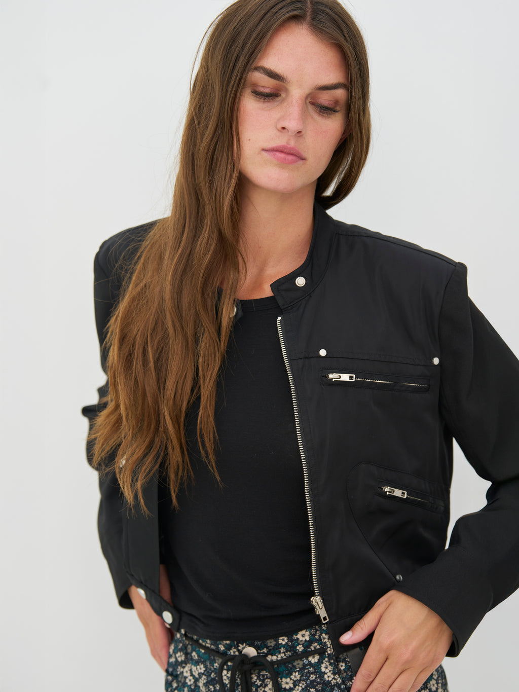 Denne jakke har et moderne, cool udtryk med sin korte længde og kombinationen af matte og glatte materialer. Foran har den flere lynlåse og trykknapper, der tilføjer både funktion og karakter til designet. Den høje hals med trykknap giver et skarpt udtryk, mens de lange ærmer afrunder looket på en klassisk måde. Bagpå holdes jakken enkel med rene linjer. Style den over en top, kjole eller let strik for et stilfuldt hverdagslook med kant.