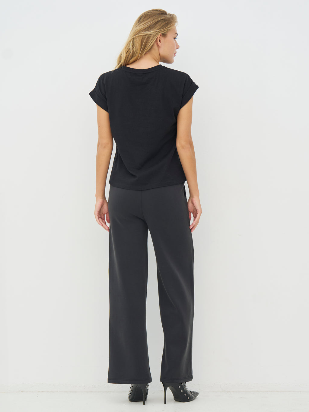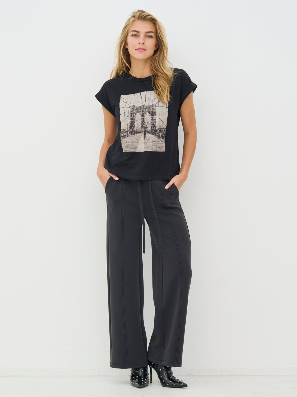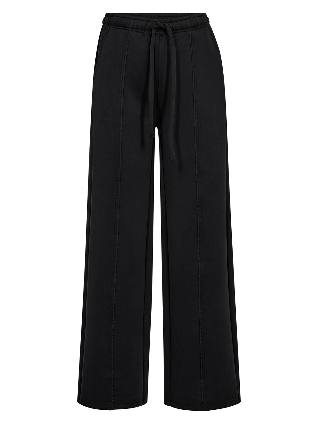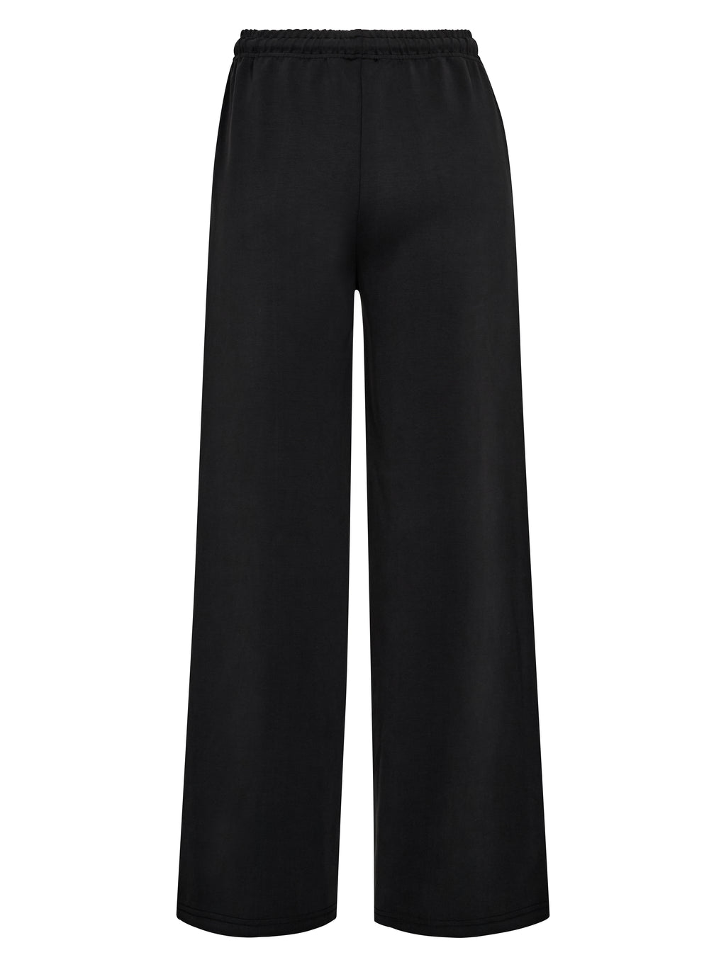 Disse bukser har en afslappet pasform med lige, vide ben samt elastik og snøre i taljen, som gør dem nemme at justere. Langs benene løber et diskret bånd med en let 3D-effekt, der giver dybde og et fint twist til det ellers rolige udtryk. Fronten er enkel med lodrette sømdetaljer, mens bagsiden er helt plain. Bukserne er meget stretchy og bløde, hvilket gør dem behagelige at bruge hele dagen. Style dem med den matchende jakke for et gennemført sæt, eller med en bluse eller skjorte for et afslappet hverdagslook.