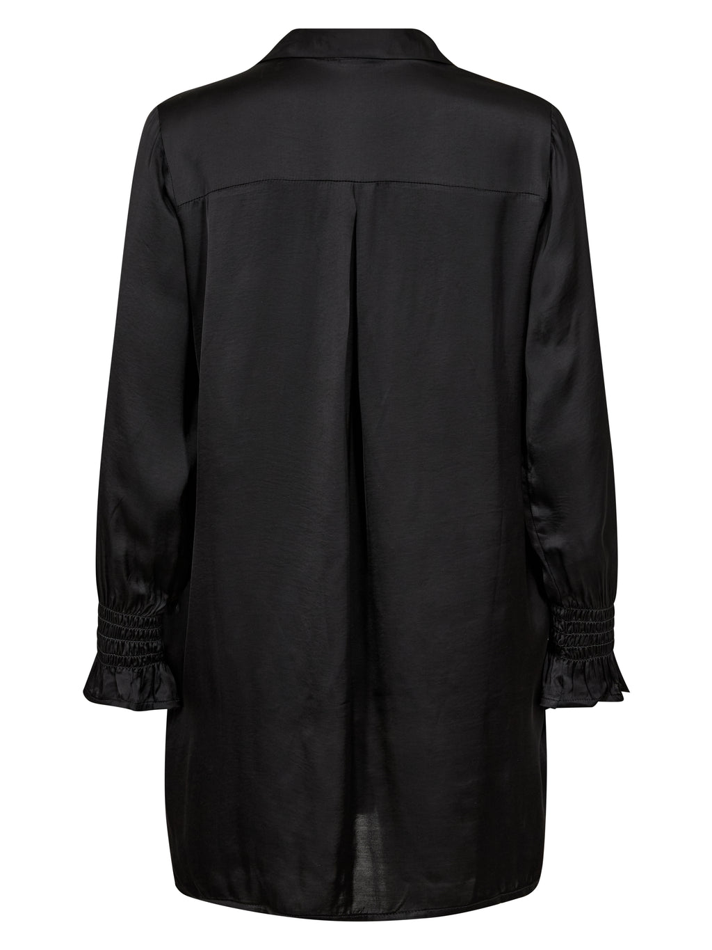 Denne tunika er den perfekte kombination af komfort og stil. Fremstillet i en glansfuld viskose, der gør den til en luksuriøs style for ethvert outfit. Tunikaen er designet i en løstsiddende silhuet med en feminin V-udskæring med en klassisk skjortekrave og lange ærmer med en fin smock-detalje. Tilføj et strejf af glamour til dit outfit med denne tunika - brug den sammen med et par af dine hverdagsbukser eller leggings.