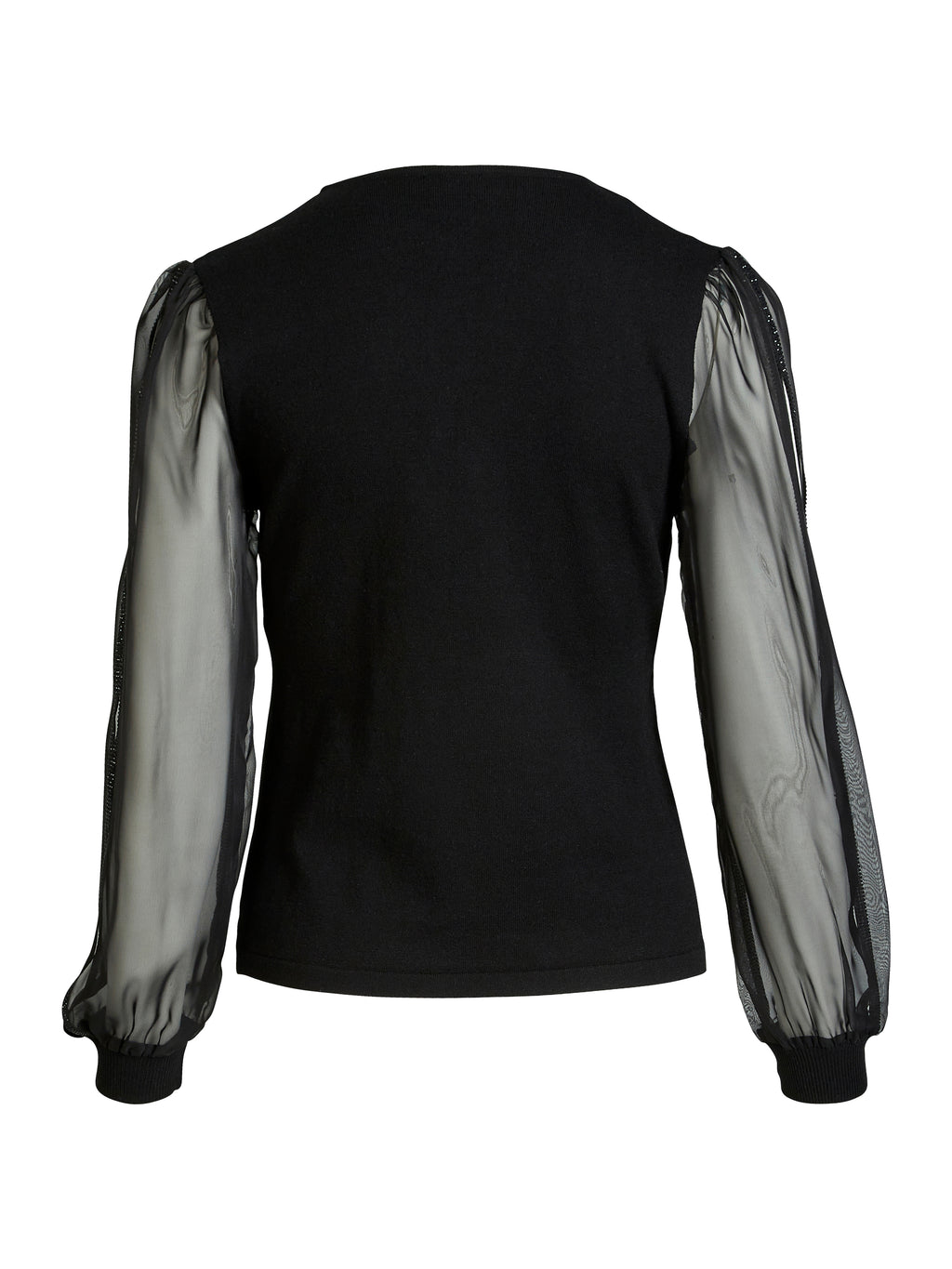 Tilføj et feminint og sofistikeret touch til din garderobe med denne strikkede bluse. Den har en flatterende slå-om-effekt foran og bløde, transparente ballonærmer, som skaber en fin kontrast til den tætvævede strikkvalitet i kroppen. De ribstrikkede manchetter fuldender designet og sikrer en god pasform.