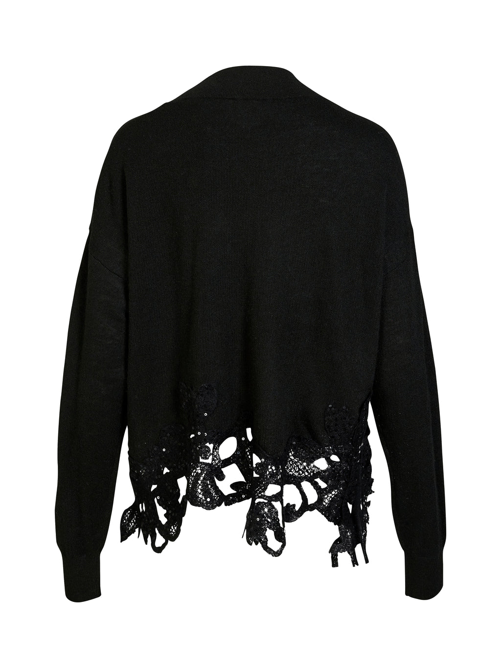 Giv dit outfit et eksklusivt touch med denne strikkede poncho med dekorativ blondekant. Den har en afslappet pasform og en rund halsudskæring, mens den markante blonde forneden giver et feminint og festligt udtryk. Det let transparente blondefelt prydes af små pailletter, der fanger lyset og skaber diskret glans.