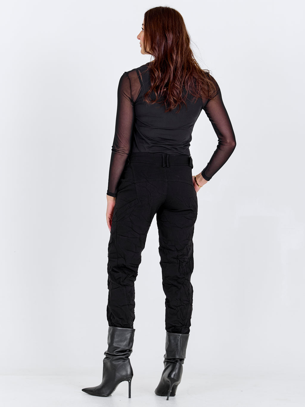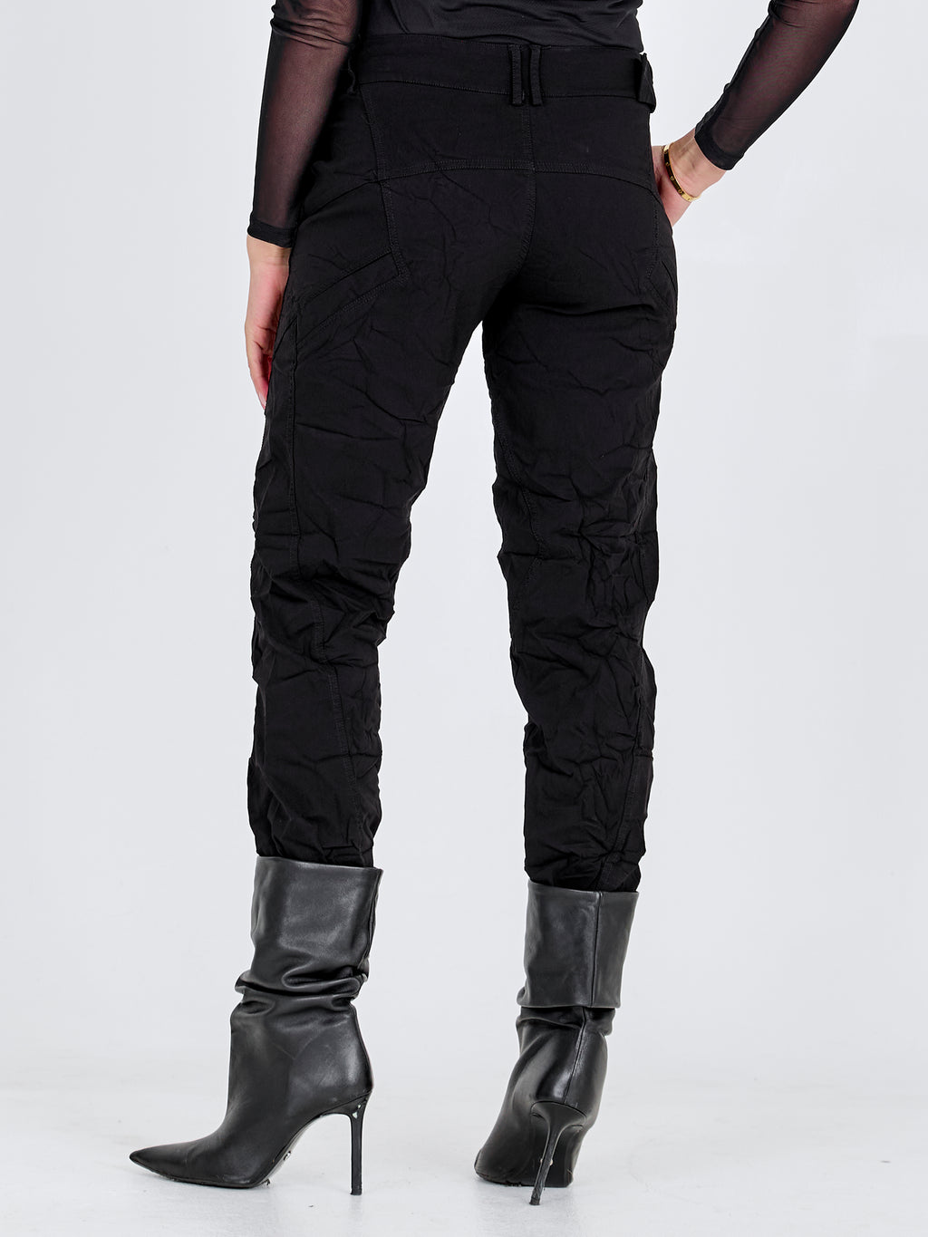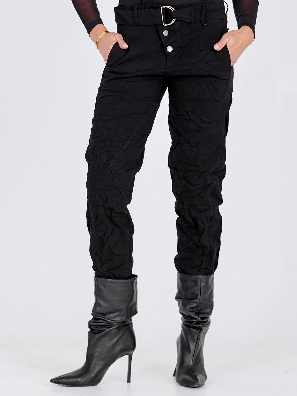 Disse bukser er designet med et smalt ben og en markant linning, som giver et enkelt og tidløst udtryk. Foran har de en skrå knaplukning samt et bælte med metalring, der tilføjer et stilrent detaljespil. Bagpå er snittet rent med bæltestropper og markeringer, som understreger pasformen. Style dem med en let strik eller en skjorte for et afslappet, men gennemført look til hverdagen.