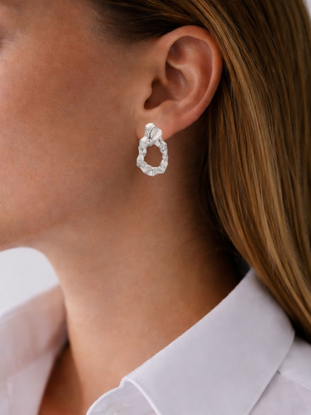 Denne ørering har et organisk og kunstnerisk udtryk, formet med bløde, ujævne linjer, der skaber et levende og skulpturelt look. Den åbne silhuet giver et let og moderne præg, som gør smykket nemt at style til både hverdag og fest. En iøjnefaldende detalje, der tilføjer karakter til ethvert outfit – uanset om den bæres alene eller sammen med andre øreringe.