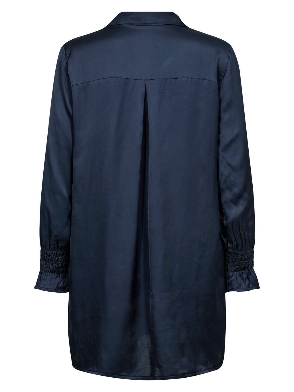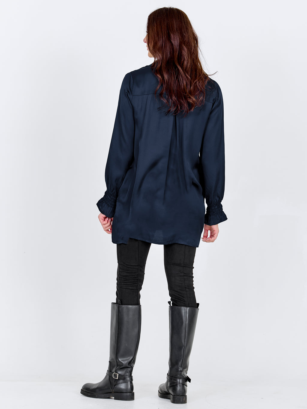 Denne tunika er den perfekte kombination af komfort og stil. Fremstillet i en glansfuld viskose, der gør den til en luksuriøs style for ethvert outfit. Tunikaen er designet i en løstsiddende silhuet med en feminin V-udskæring med en klassisk skjortekrave og lange ærmer med en fin smock-detalje. Tilføj et strejf af glamour til dit outfit med denne tunika - brug den sammen med et par af dine hverdagsbukser eller leggings.