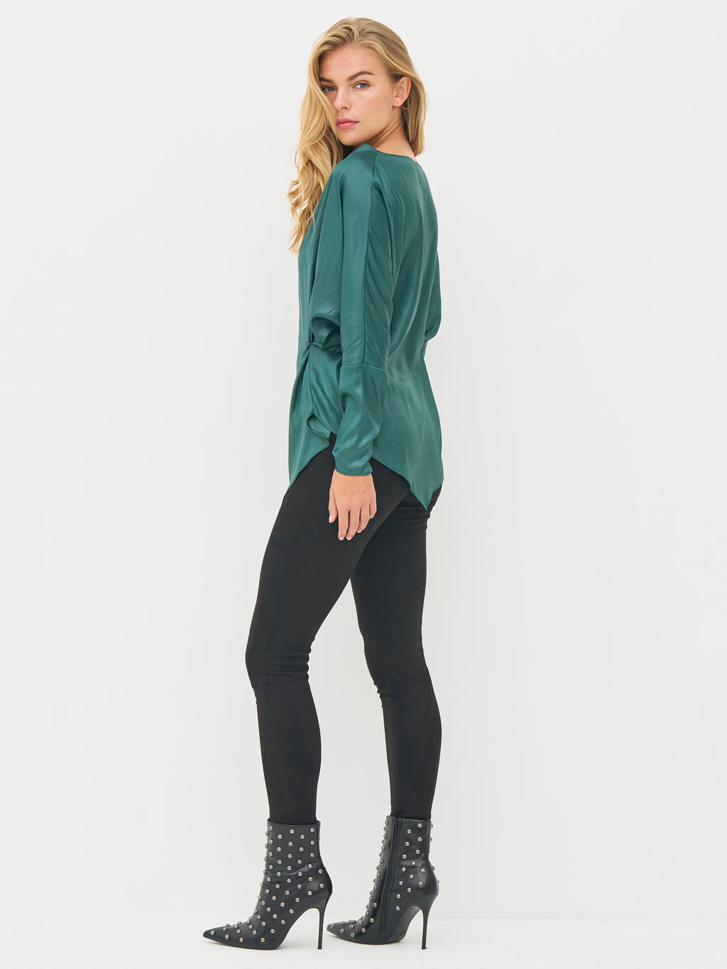 Tilføj et moderne twist til garderoben med denne bløde, blanke bluse. Den har en løs pasform og et særligt spidst skørt, der skaber en flatterende og iøjnefaldende silhuet. Ærmerne er lange med bred afslutning og let rynk, som tilfører ekstra karakter til det enkle design.