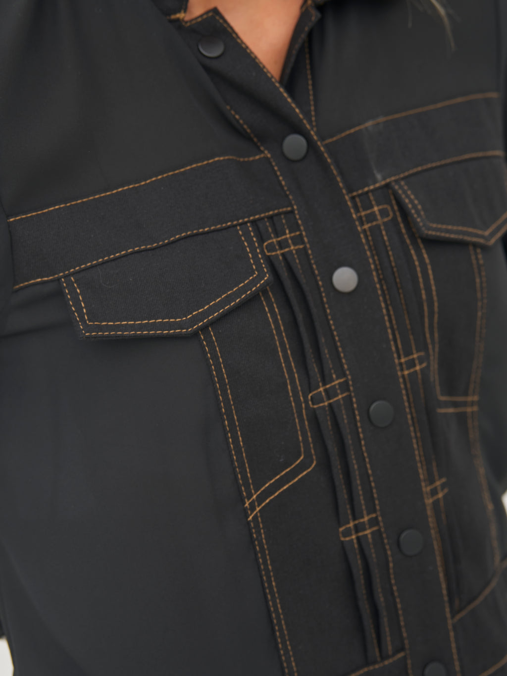 Denne kjole kombinerer klassiske denimdetaljer med moderne design. Den har skjortekrave, knaplukning hele vejen ned og kontrastsyninger, som fremhæver de strukturelle linjer. Lommer både for og bag tilføjer funktionalitet, mens den nederste del i transparent materiale giver et let og feminint udtryk.