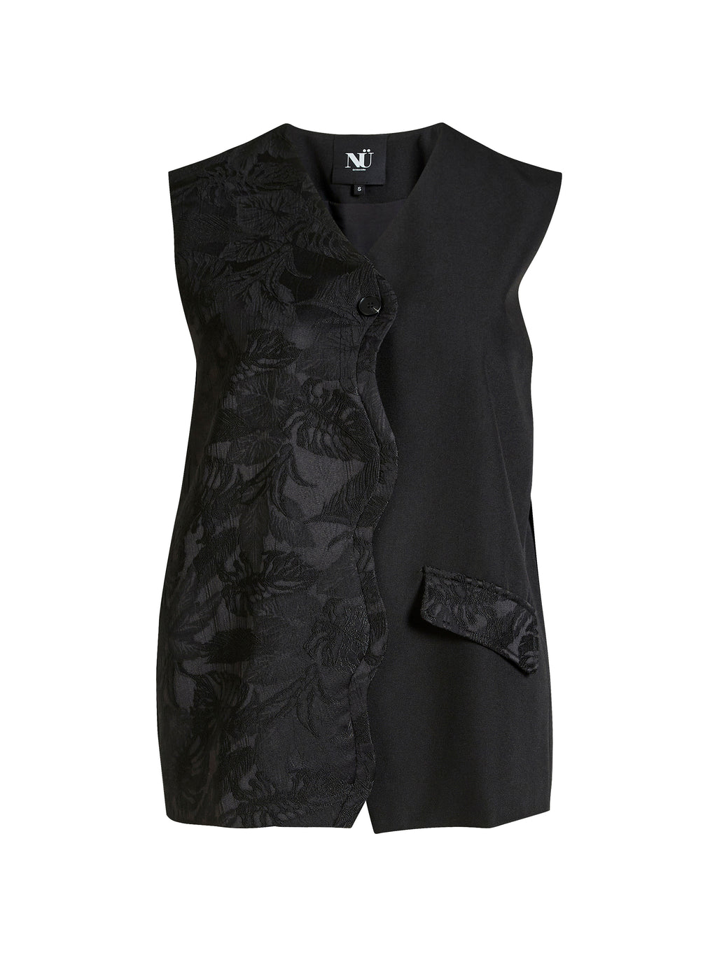 Denne vest kombinerer klassisk snit med fine detaljer. Den er ærmeløs og har en flot asymmetrisk front med dekorativ knaplukning. Den ene side er prydet med struktureret materiale i blomstermønster, som skaber en elegant kontrast. En lille skrå flapdetalje foran fuldender udtrykket.