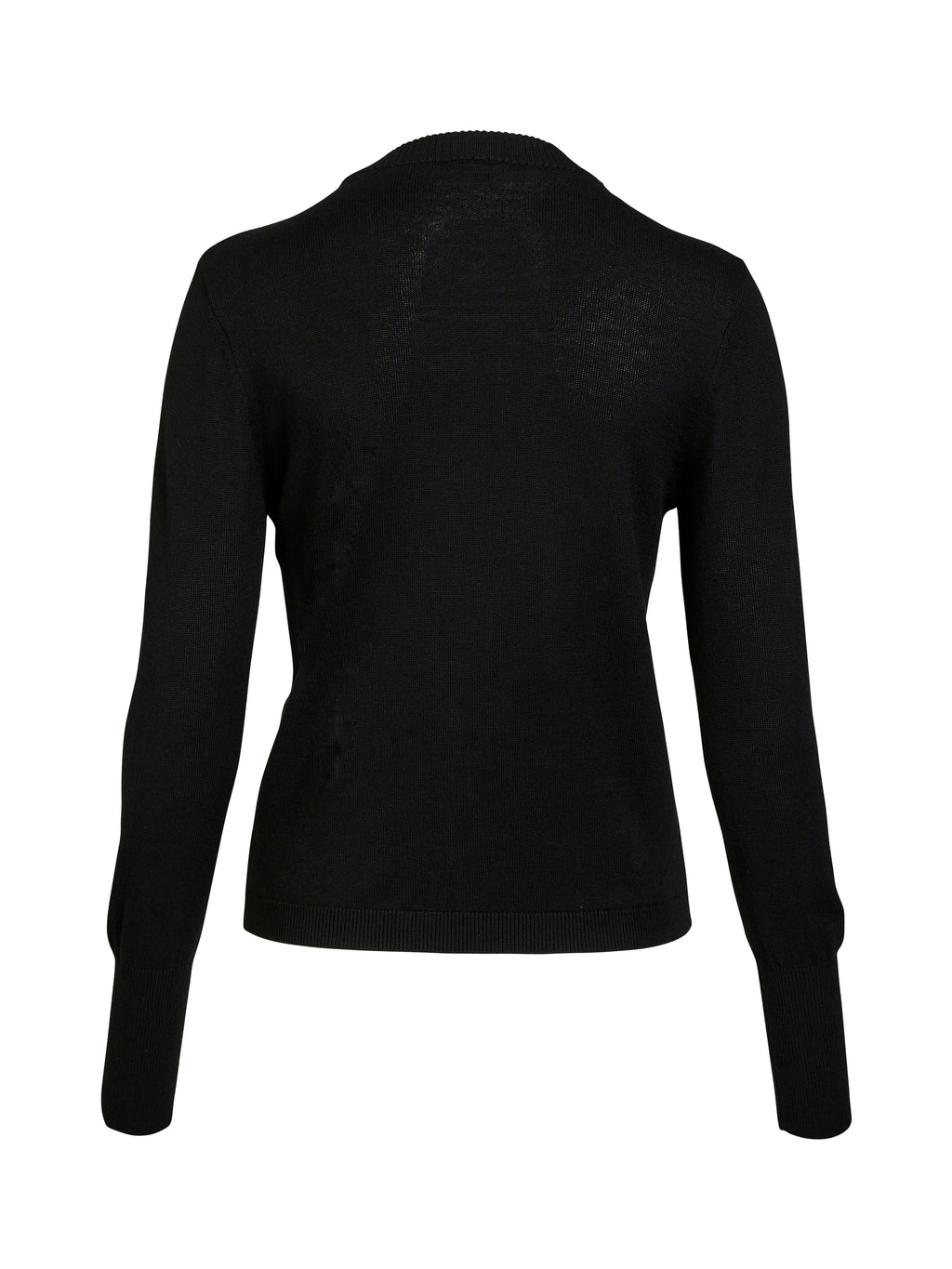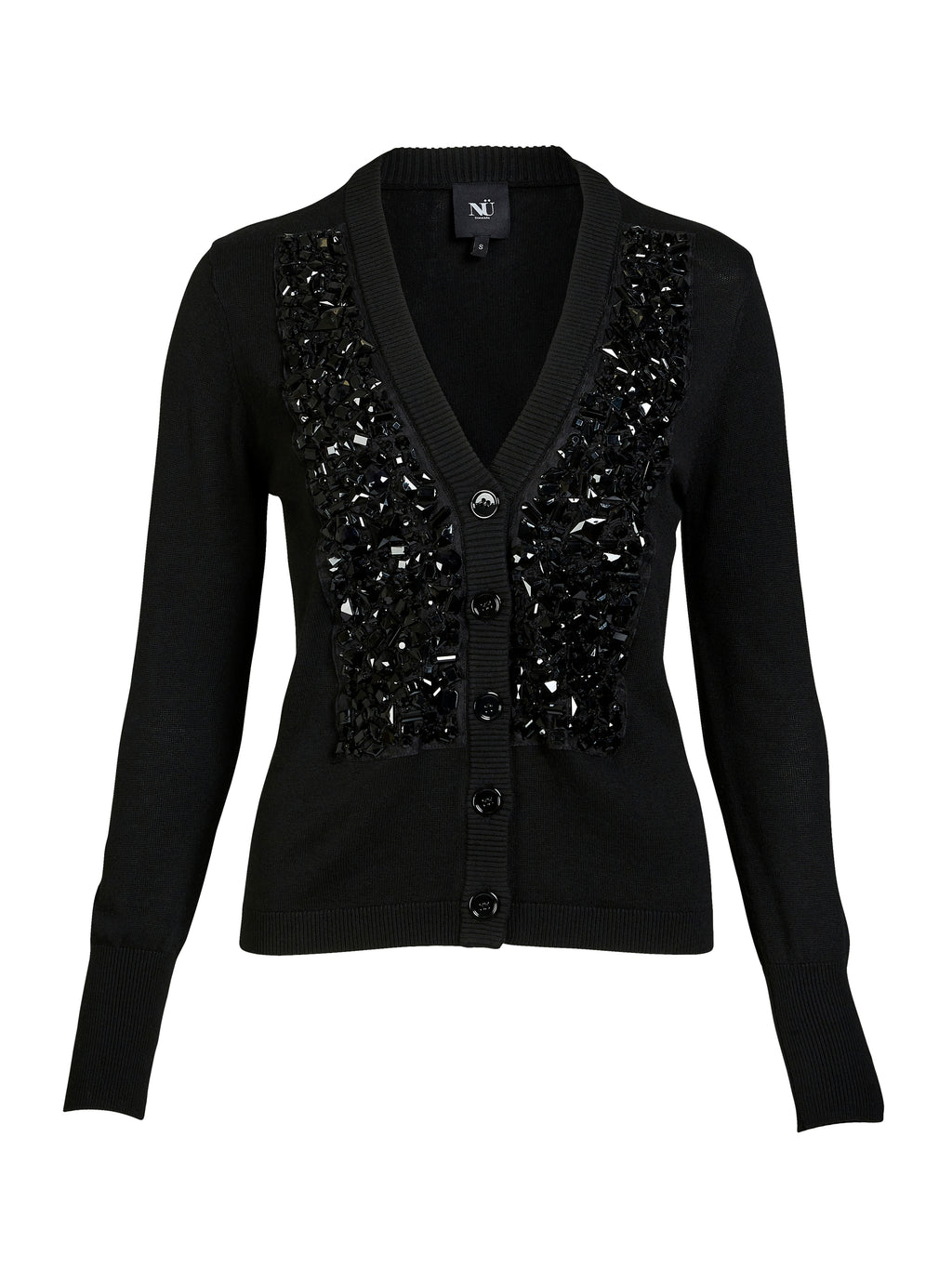 Denne strikcardigan kombinerer klassisk pasform med festlige detaljer. Den har dyb V-udskæring, ribkanter og lukkes med knapper fortil. Forstykket er pyntet med blanke nitter og sten i forskellige former, som giver et eksklusivt og iøjnefaldende udtryk.