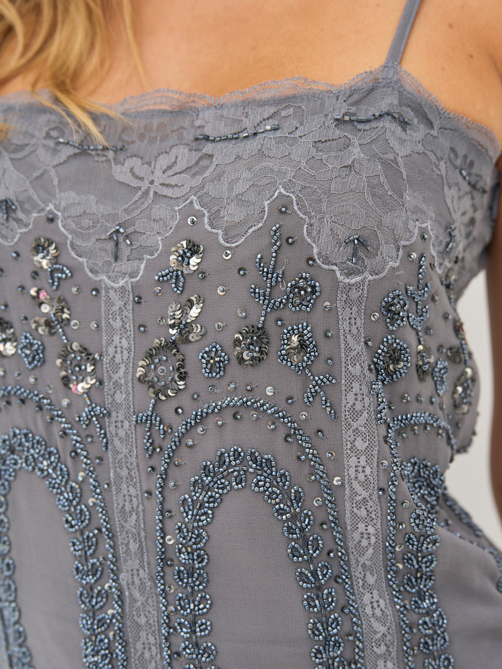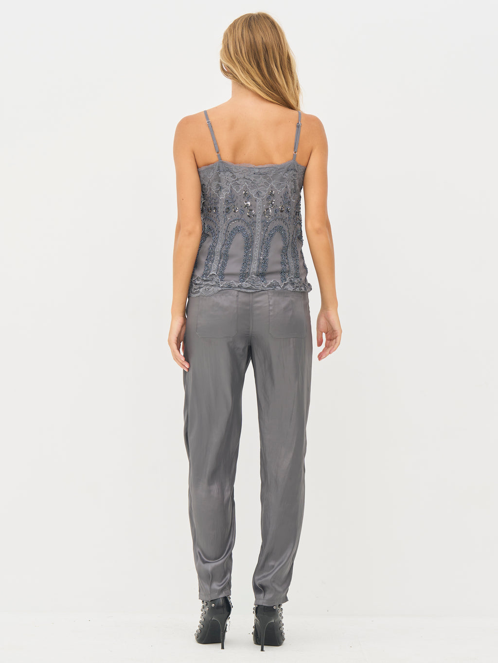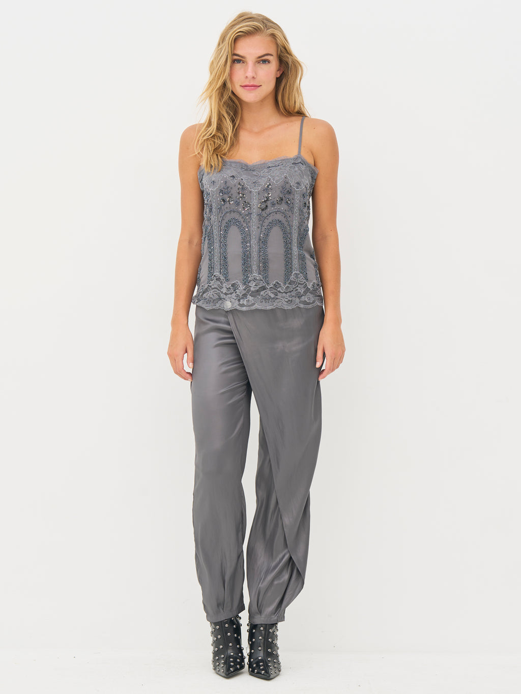Denne top emmer af finesse med sine delikate blonder og broderede perledetaljer, der skaber et smukt og dekorativt udtryk. Den let figursyede pasform og de justerbare stropper sikrer en behagelig og personlig pasform. Toppen har en glat inderside, som giver komfort, mens det ydre lag i blonde og perler tilfører struktur og dybde.