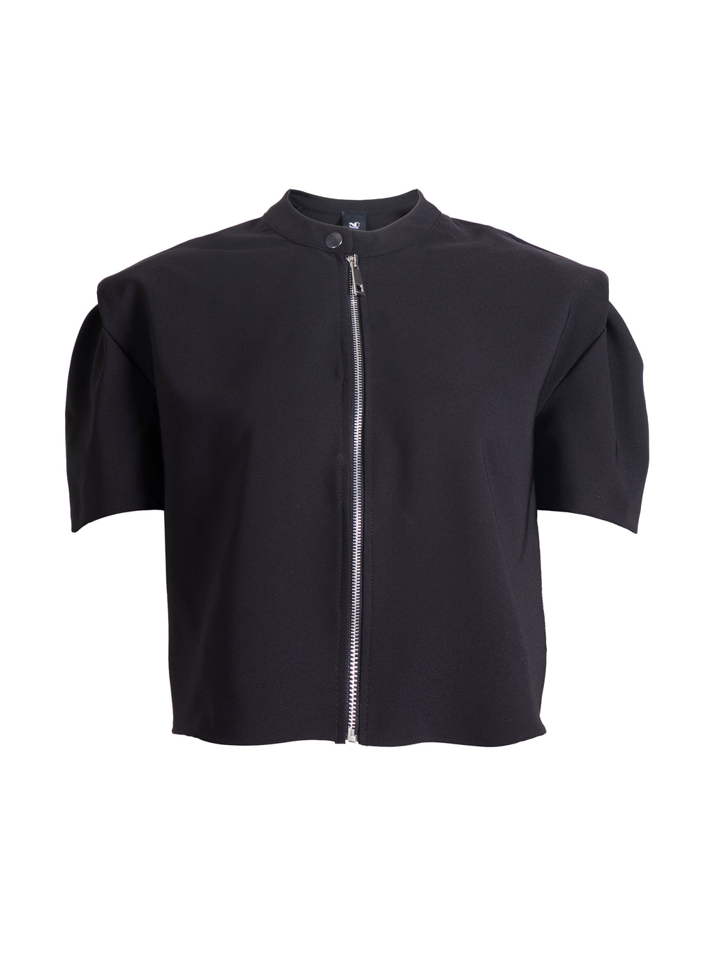 Giv dit outfit et moderne twist med denne korte bolerojakke, der kombinerer struktur og enkelhed. Jakken har korte, let markerede ærmer og en gennemgående lynlås foran, som tilfører et cool og stilrent udtryk. Den elastiske kant forneden skaber en let afrundet pasform, som gør den både komfortabel og flatterende.