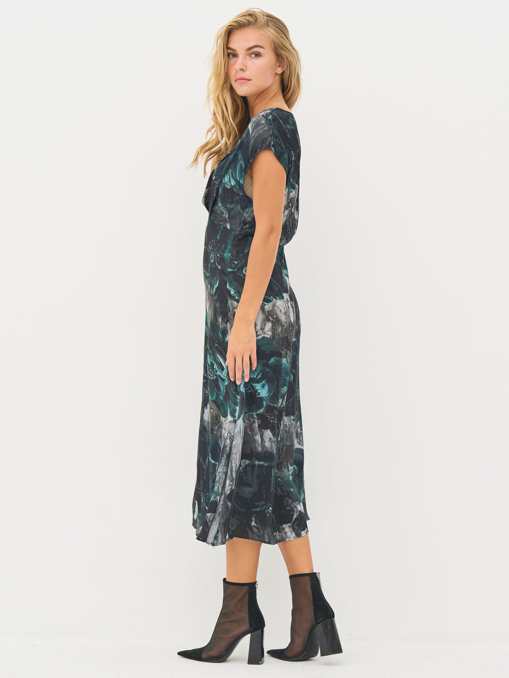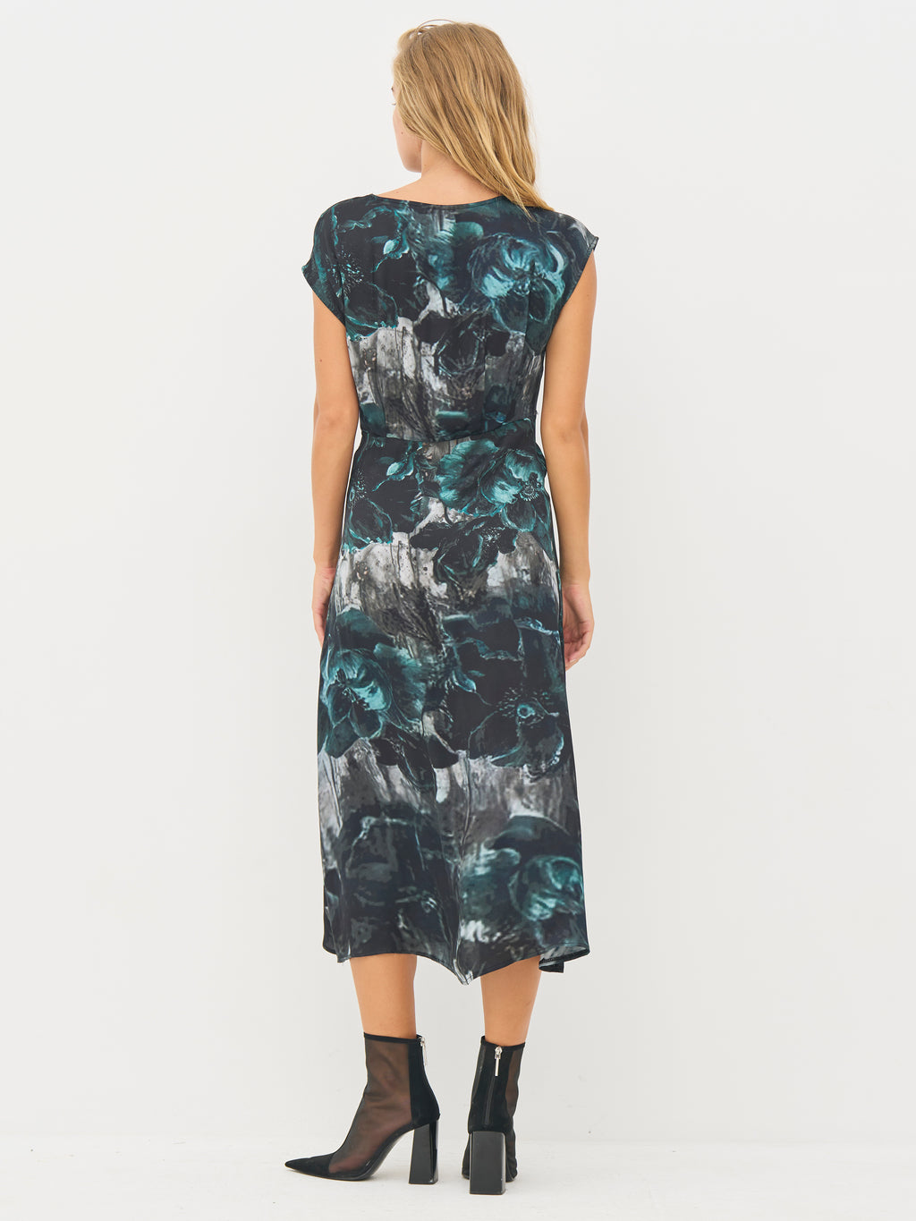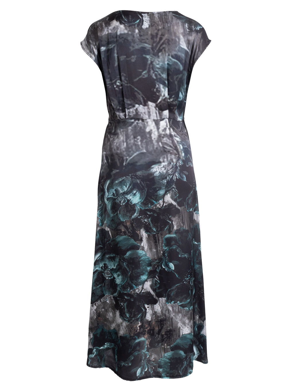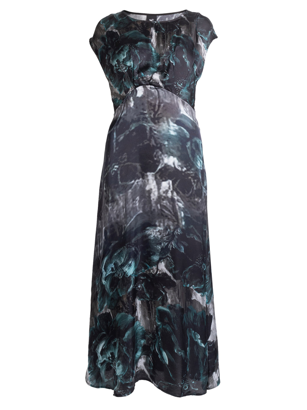 Et elegant valg til både hverdag og festlige lejligheder. Denne lange kjole har et flot fald og et feminint snit med let markeret talje. Det bløde stof følger kroppen på en flatterende måde, mens det iøjnefaldende blomsterprint tilfører dybde og karakter til designet. De korte ærmer og den runde halsudskæring giver et enkelt og tidløst udtryk.