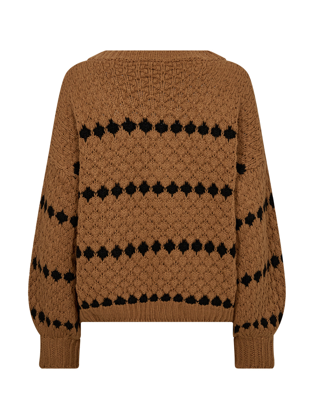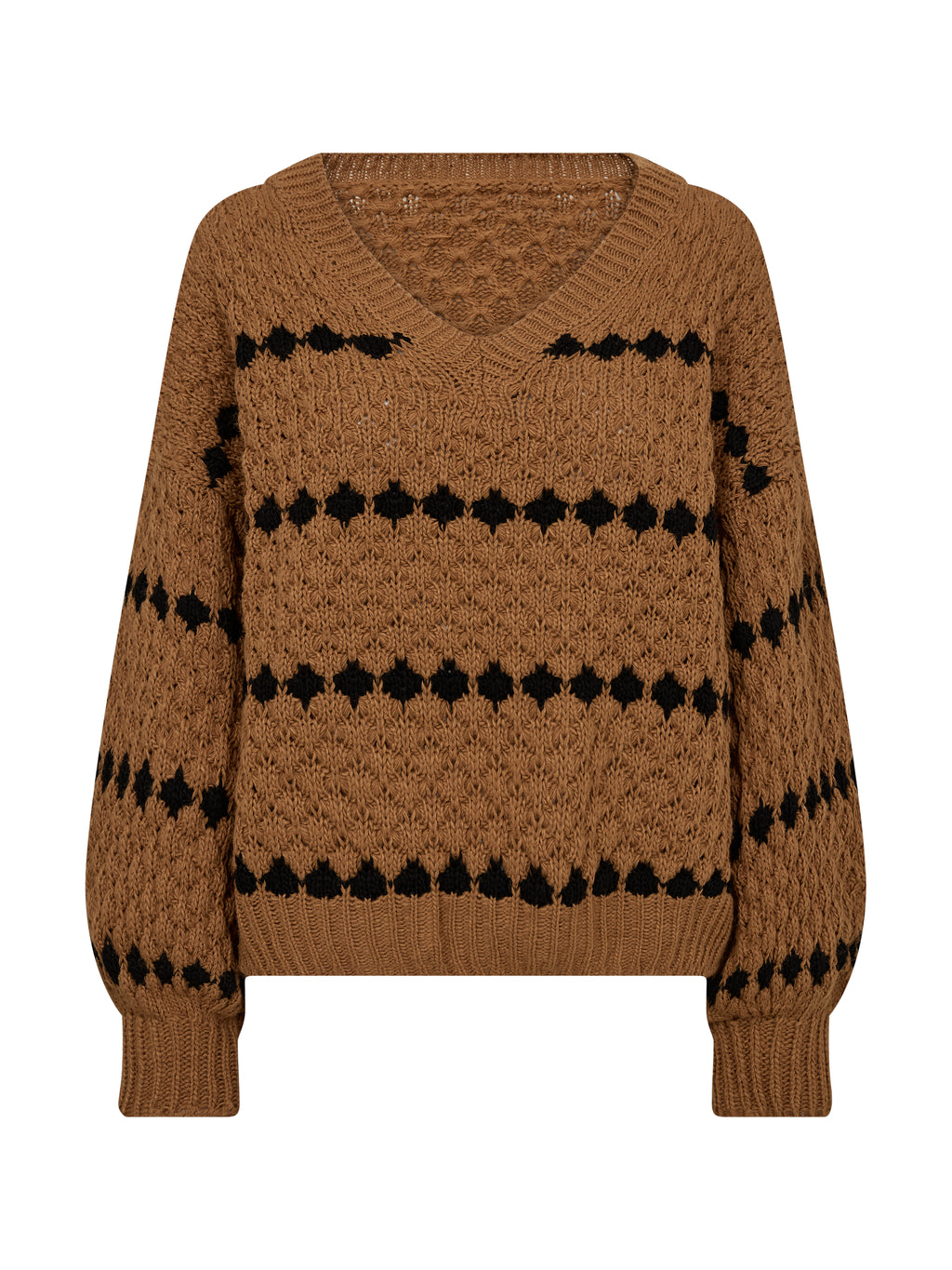 Striktrøjen har fine detaljer og et klassisk udtryk. Den har v-hals, lange ærmer og et mønsterstrikket design med striber, som giver karakter til strikken. Pasformen er almindelig med ribkant forneden og ved ærmerne, som afslutter looket på en enkel måde.