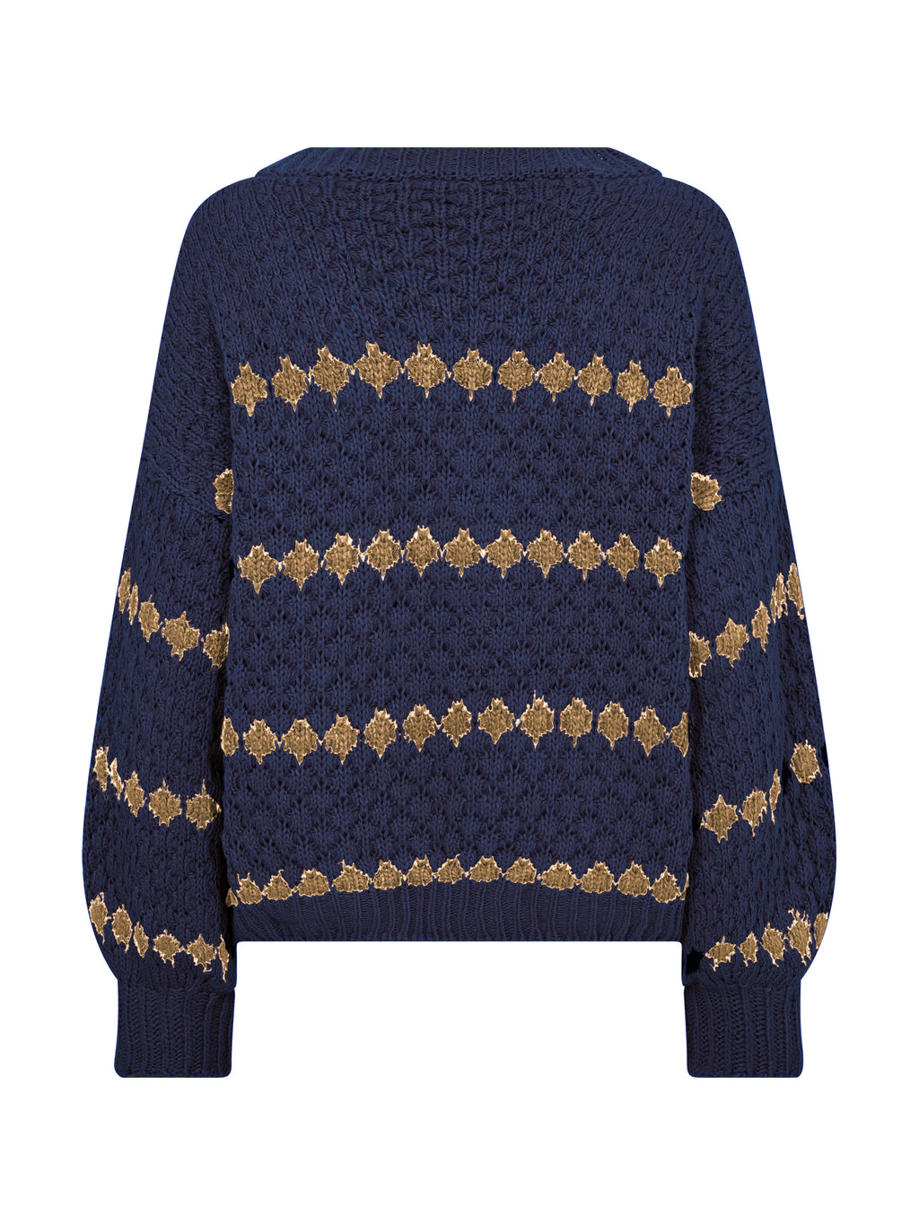 Striktrøjen har fine detaljer og et klassisk udtryk. Den har v-hals, lange ærmer og et mønsterstrikket design med striber, som giver karakter til strikken. Pasformen er almindelig med ribkant forneden og ved ærmerne, som afslutter looket på en enkel måde.
