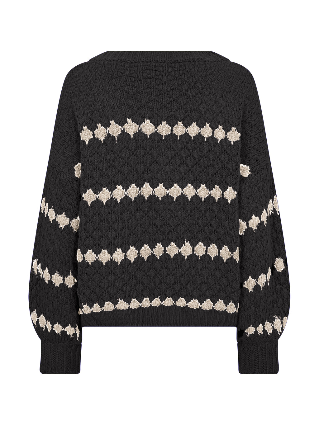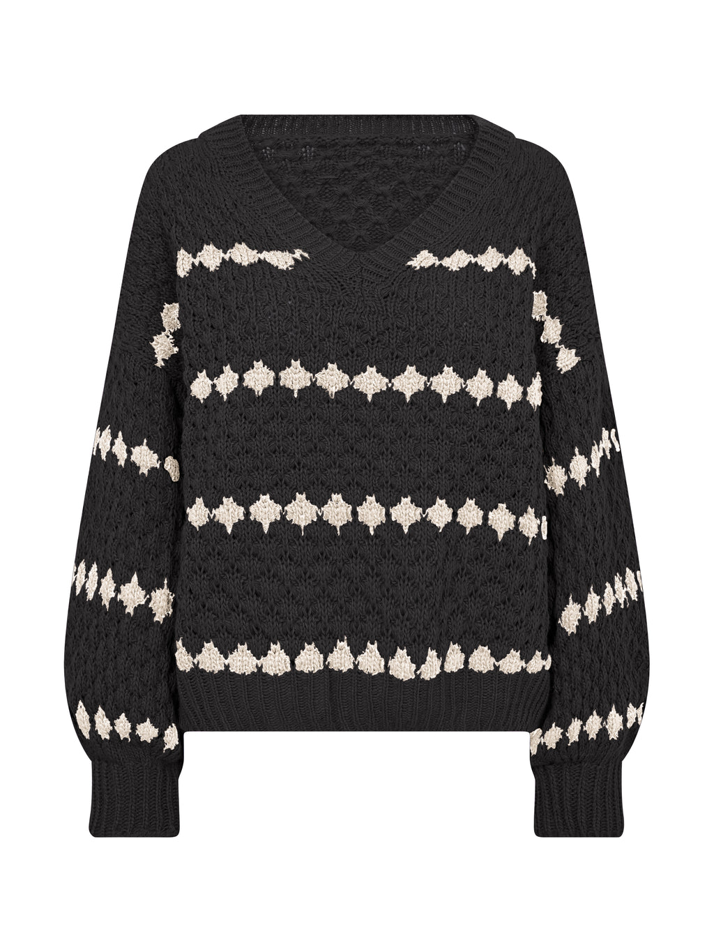 Striktrøjen har fine detaljer og et klassisk udtryk. Den har v-hals, lange ærmer og et mønsterstrikket design med striber, som giver karakter til strikken. Pasformen er almindelig med ribkant forneden og ved ærmerne, som afslutter looket på en enkel måde.