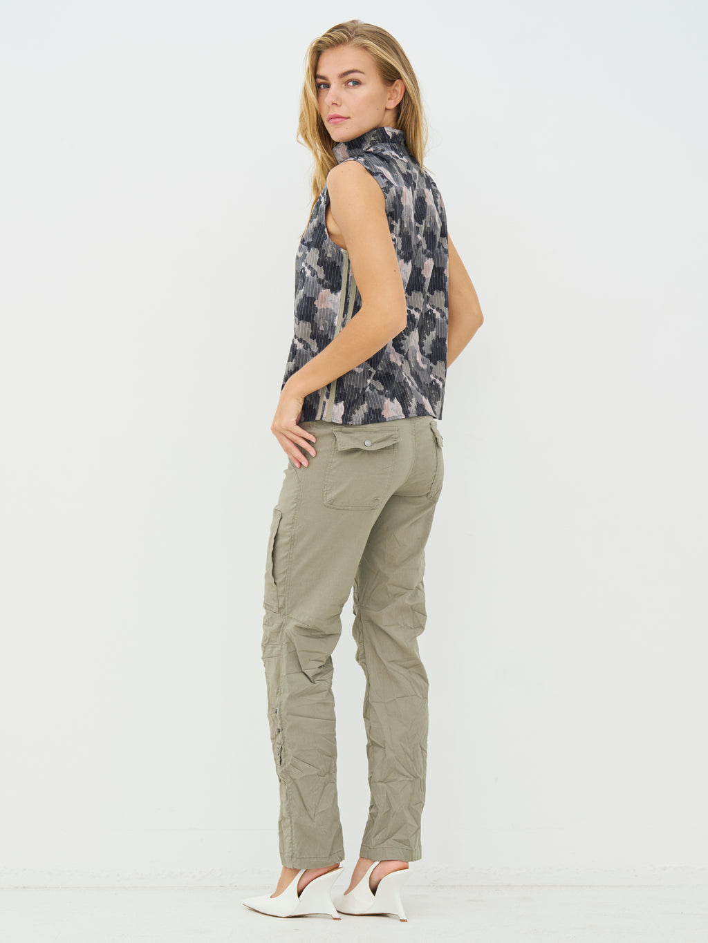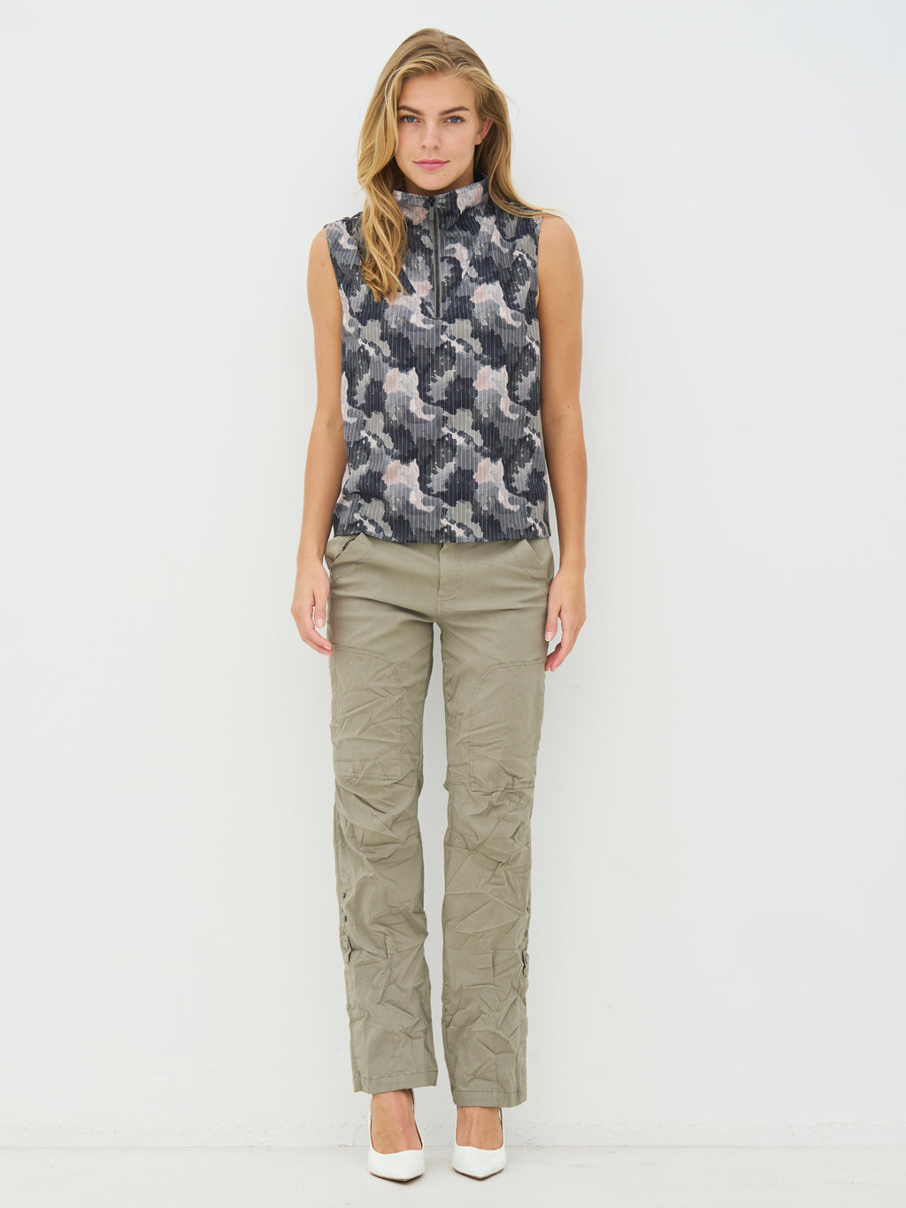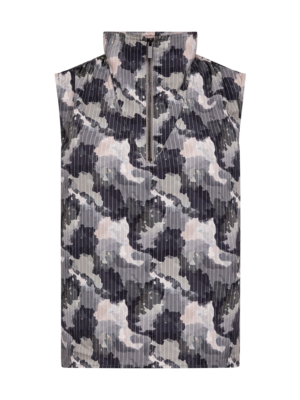 Denne top har et afslappet og moderne udtryk med en lige pasform og høj hals, der lukkes med en kort lynlås foran. Fronten er holdt rolig, mens snittet ved halsen skaber en fin V-form, der giver let kant. Stoffet falder blødt og gør toppen behagelig at have på, og bagsiden er enkel og uden detaljer. Brug den sammen med de matchende bukser for et gennemført sæt, eller style den med jeans eller shorts for et afslappet hverdagslook.