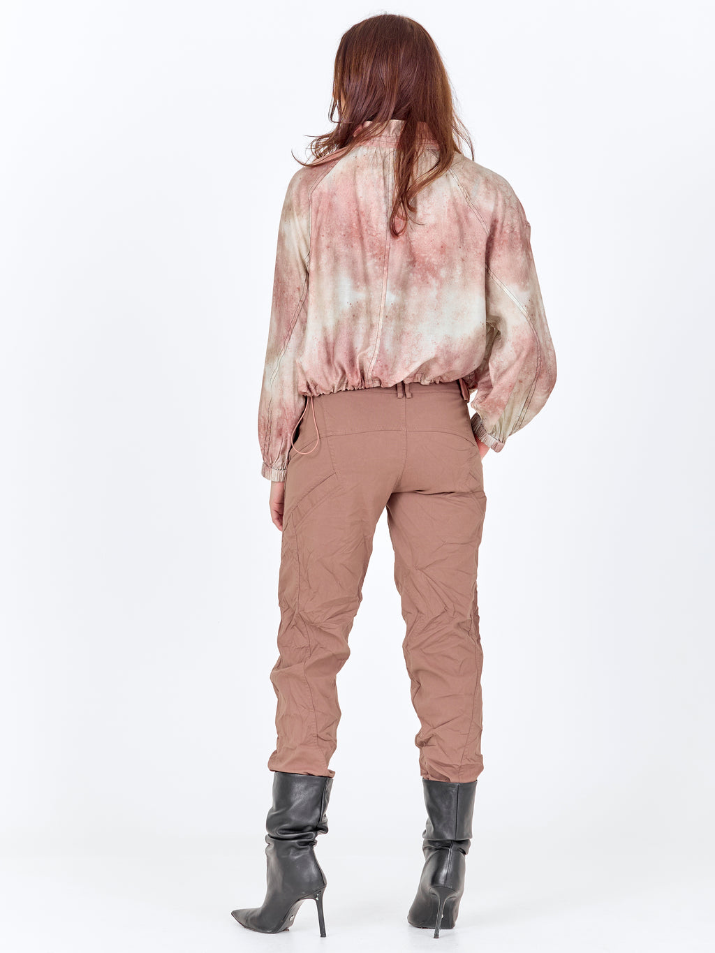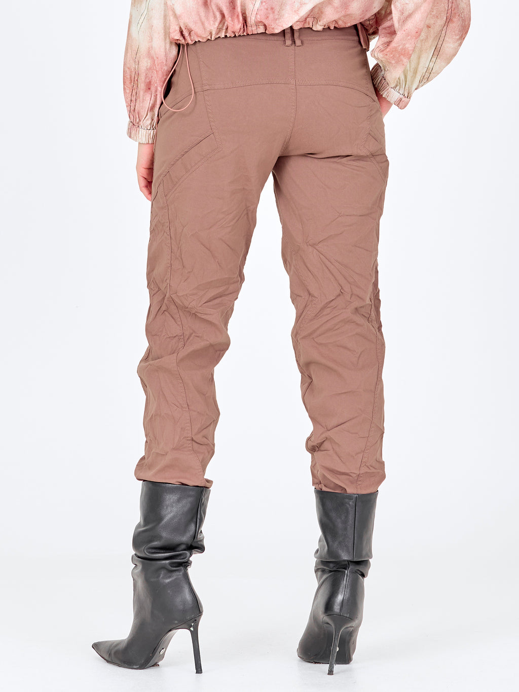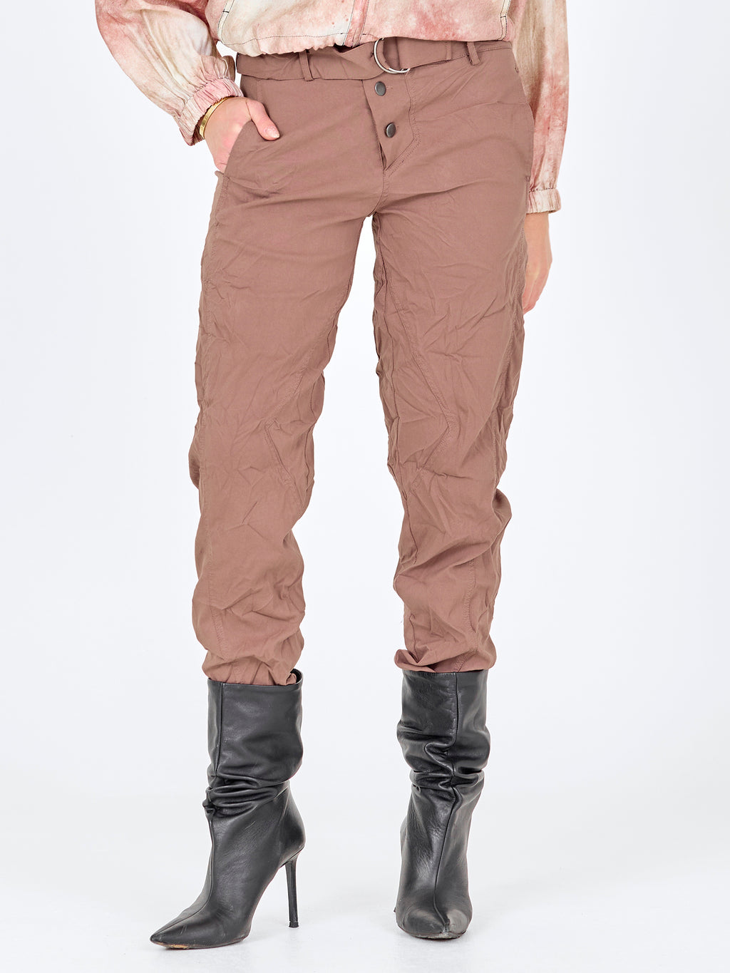 Disse bukser har et enkelt og funktionelt udtryk med en let, smal pasform, der følger benet uden at stramme. Foran har de en klassisk lukning med knapper samt et bælte med metalring, som giver et råt touch. Syningerne langs benene tilfører lidt struktur, mens bagsiden er mere rolig og enkel. Bukserne er nemme at style og fungerer godt både til hverdag og mere afslappede looks – brug dem med en skjorte, top eller let strik.