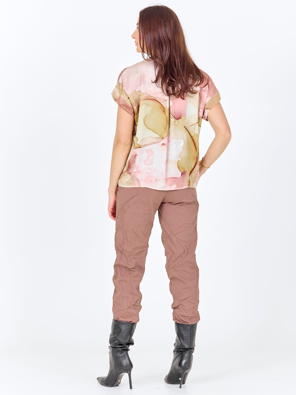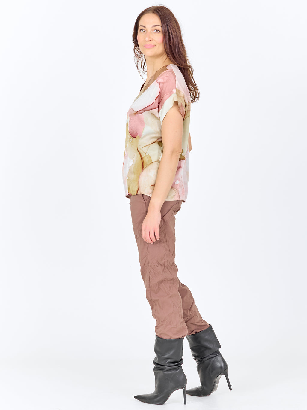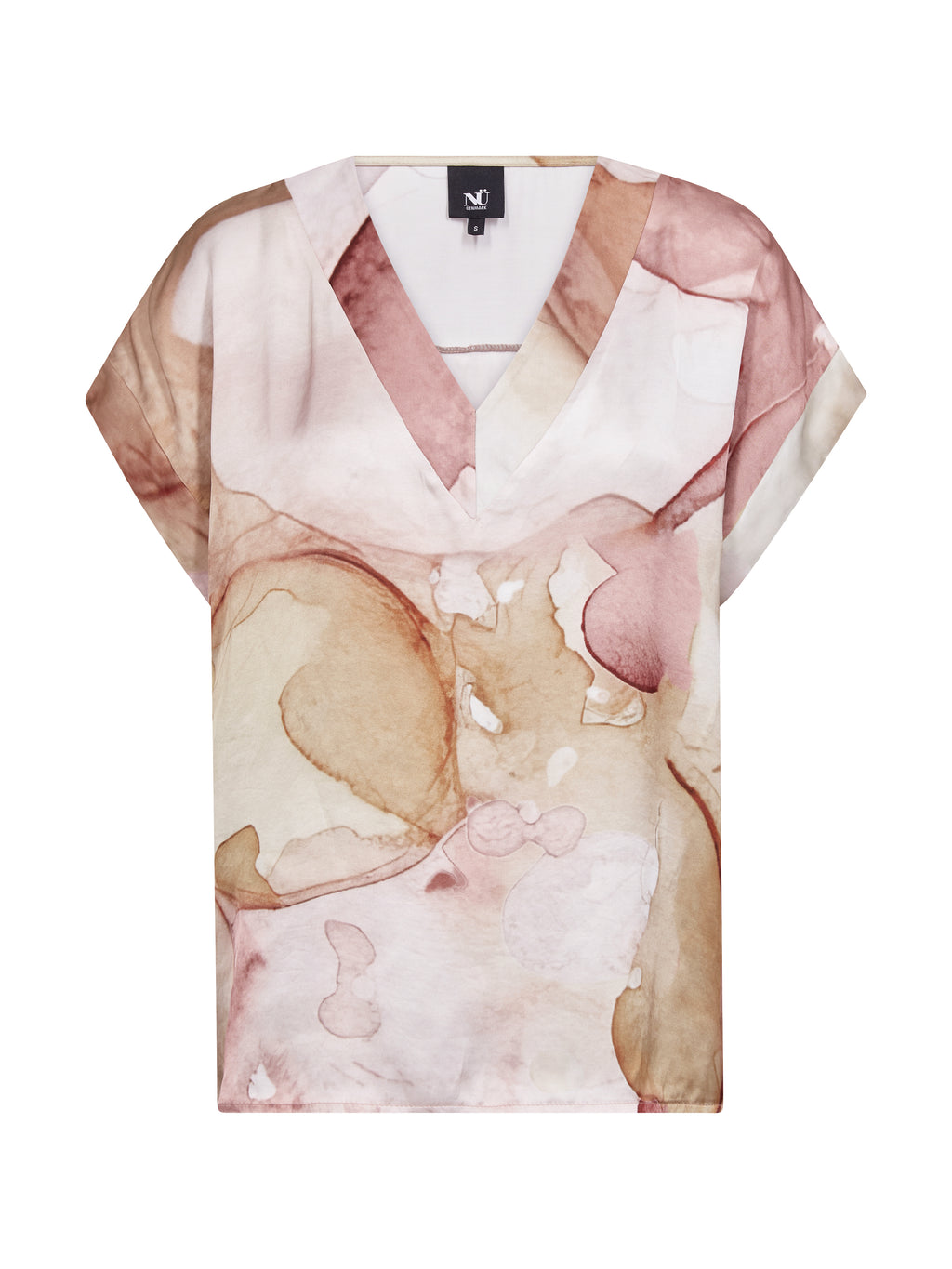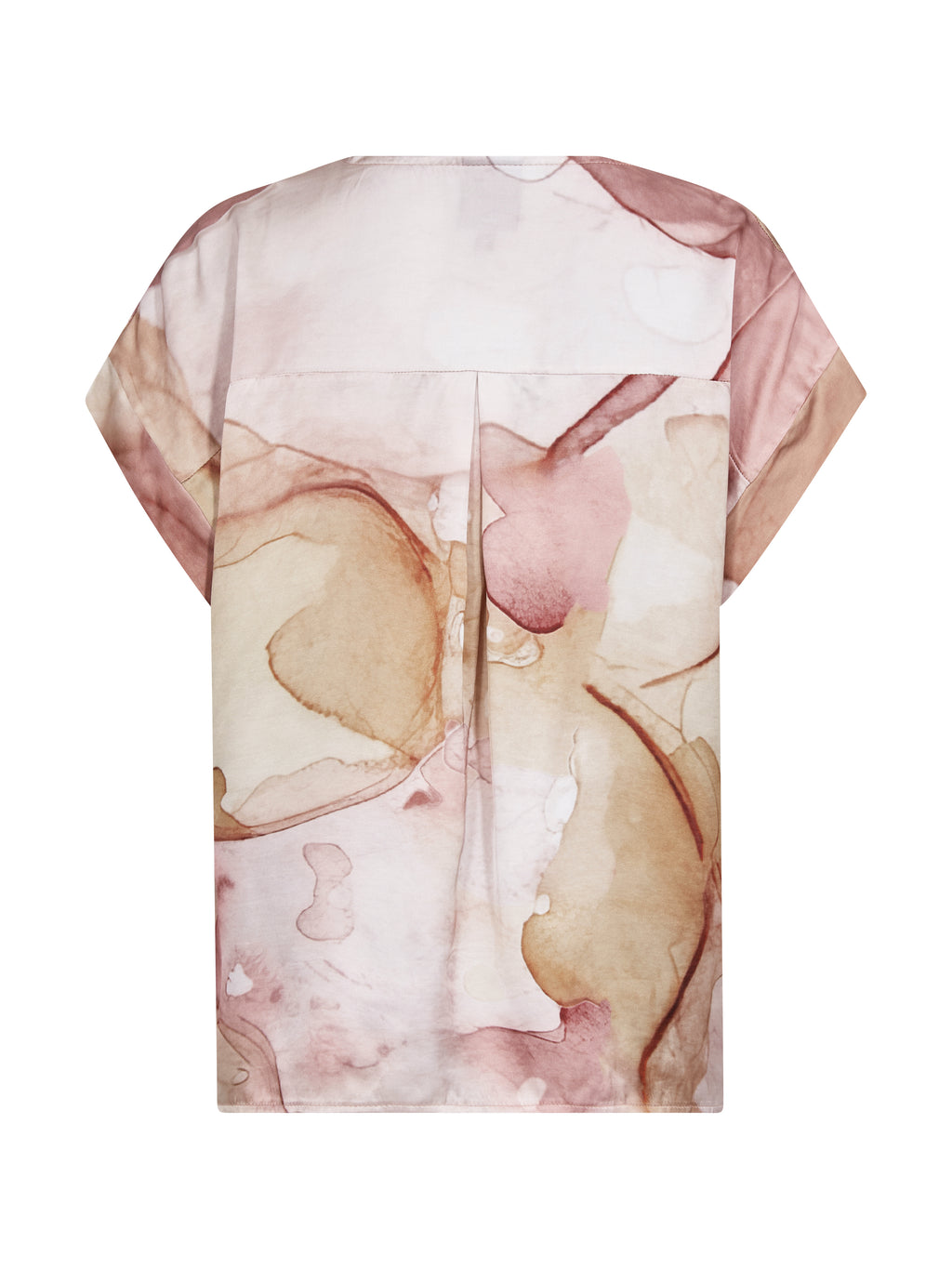 Denne bluse har et enkelt snit med V-udskæring og korte ærmer, som giver et afslappet og anvendeligt udtryk. Printet er både foran og bagpå, og tilfører karakter og kant. Pasformen er lige, så blusen falder pænt på kroppen og er nem at style til både bukser og shorts. Brug den alene til hverdag eller sammen med en let jakke, hvis du ønsker et gennemført look.