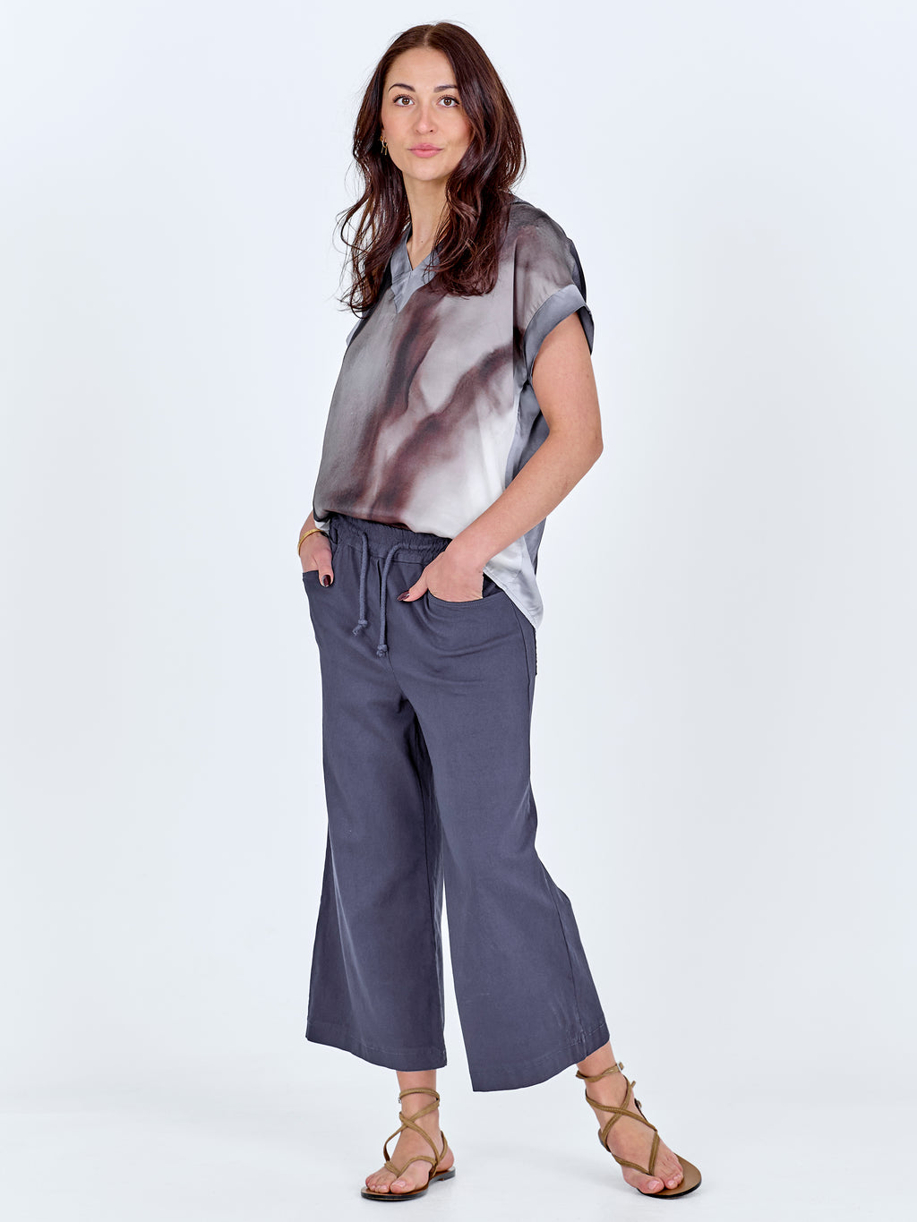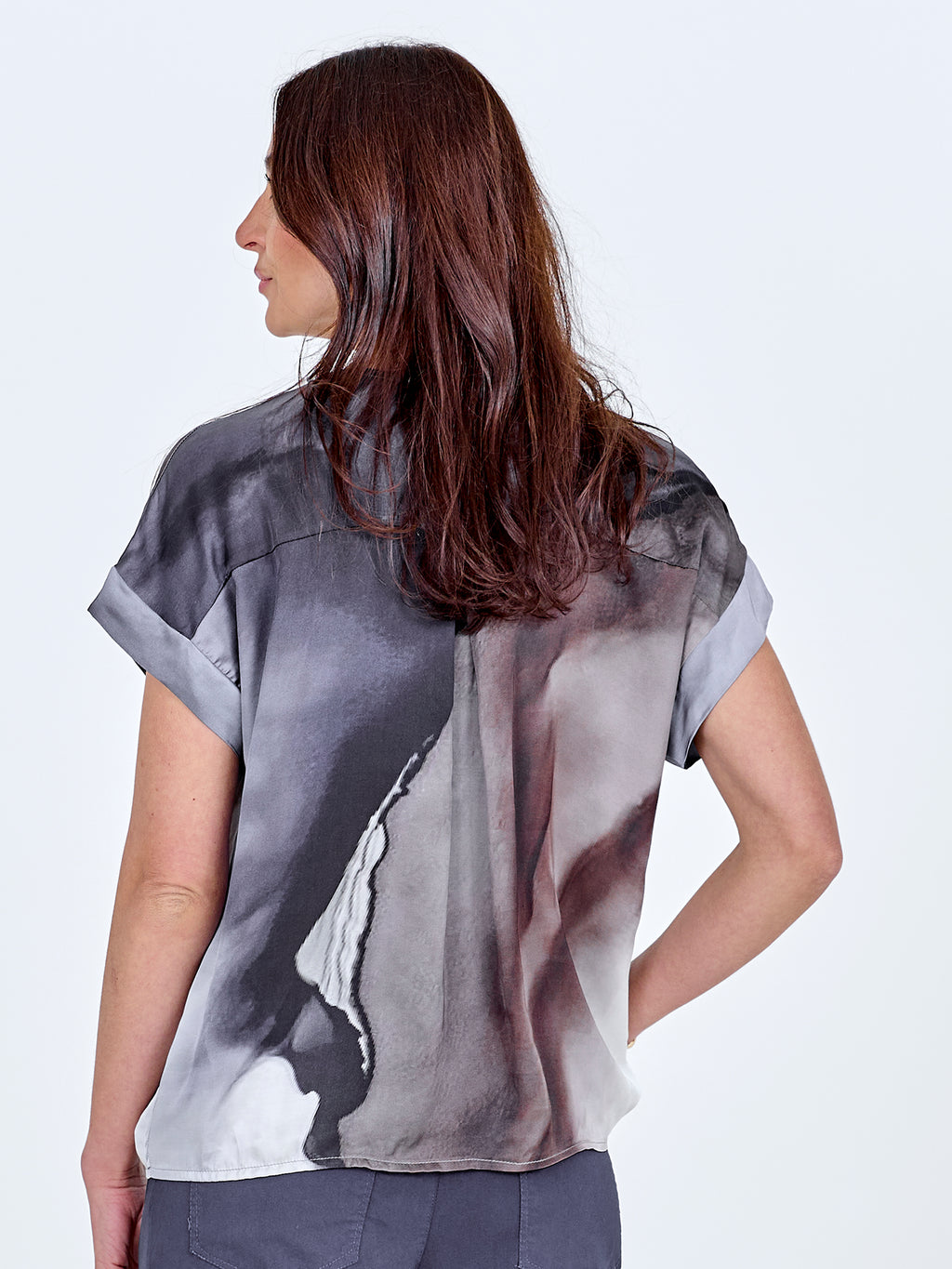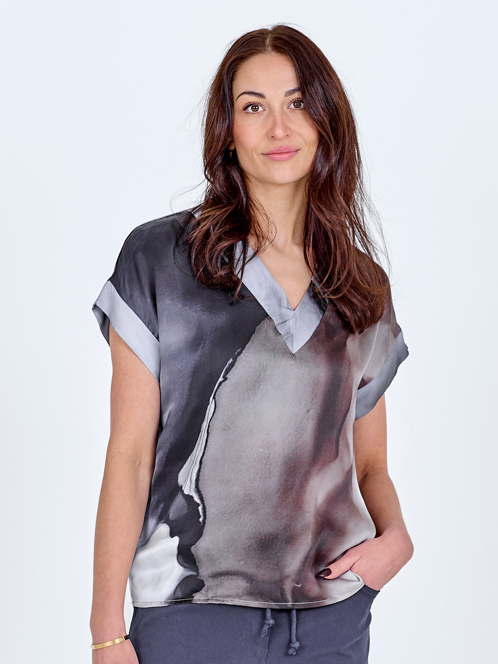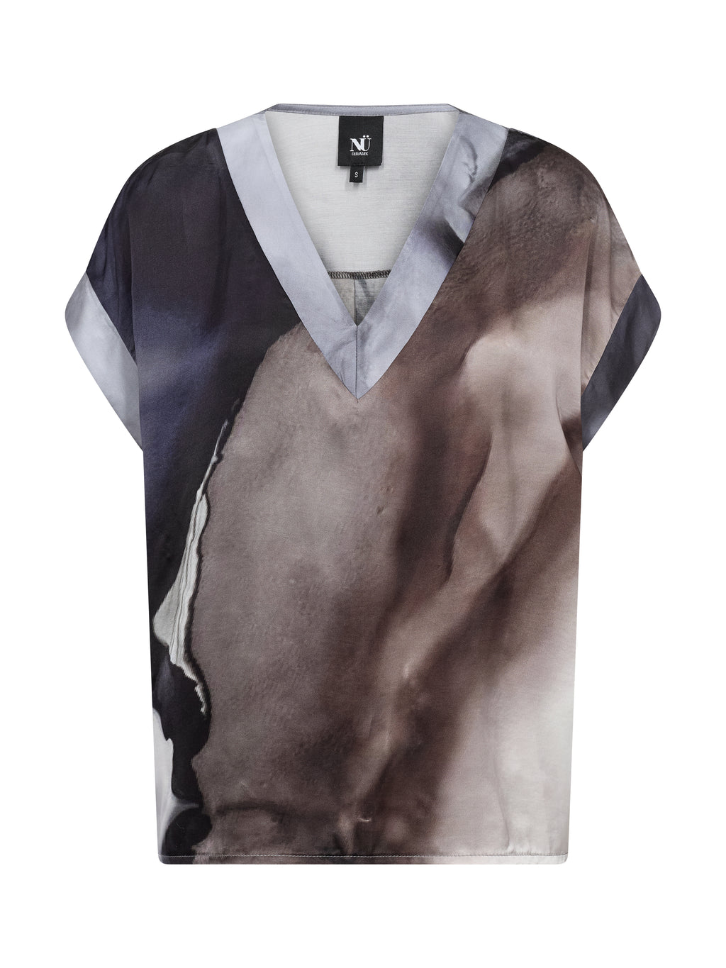 Denne bluse har et enkelt snit med V-udskæring og korte ærmer, som giver et afslappet og anvendeligt udtryk. Printet er både foran og bagpå, og tilfører karakter og kant. Pasformen er lige, så blusen falder pænt på kroppen og er nem at style til både bukser og shorts. Brug den alene til hverdag eller sammen med en let jakke, hvis du ønsker et gennemført look.