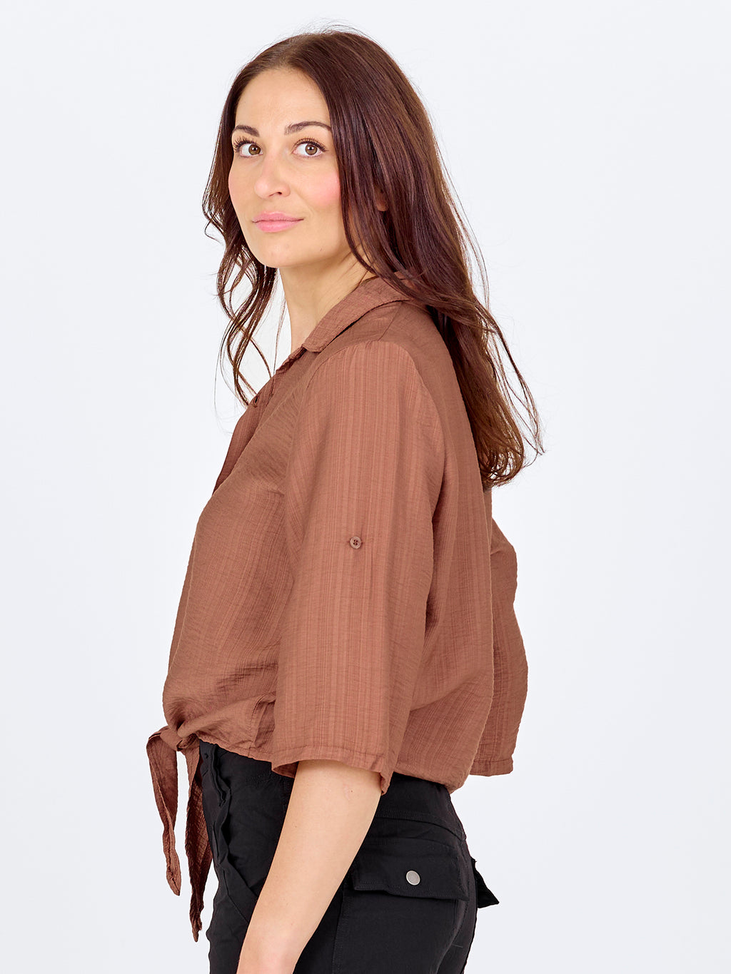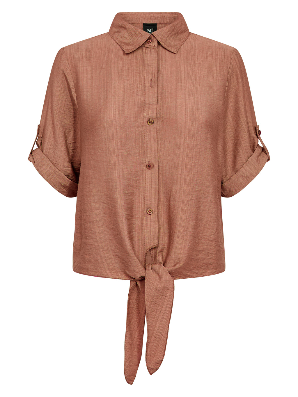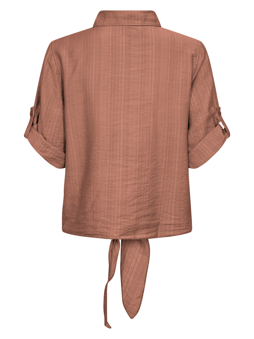 Denne skjorte har et let og afslappet udtryk med korte ærmer, der kan smøges op og fastgøres med strop. Fortil lukkes den med knapper og afsluttes med en dekorativ bindedetalje, som giver et feminint præg. Bagsiden er enkel og lige i snittet. Style skjorten med løse bukser, en nederdel eller shorts for et afslappet hverdagslook, eller brug den åben over en enkel top på varme dage.