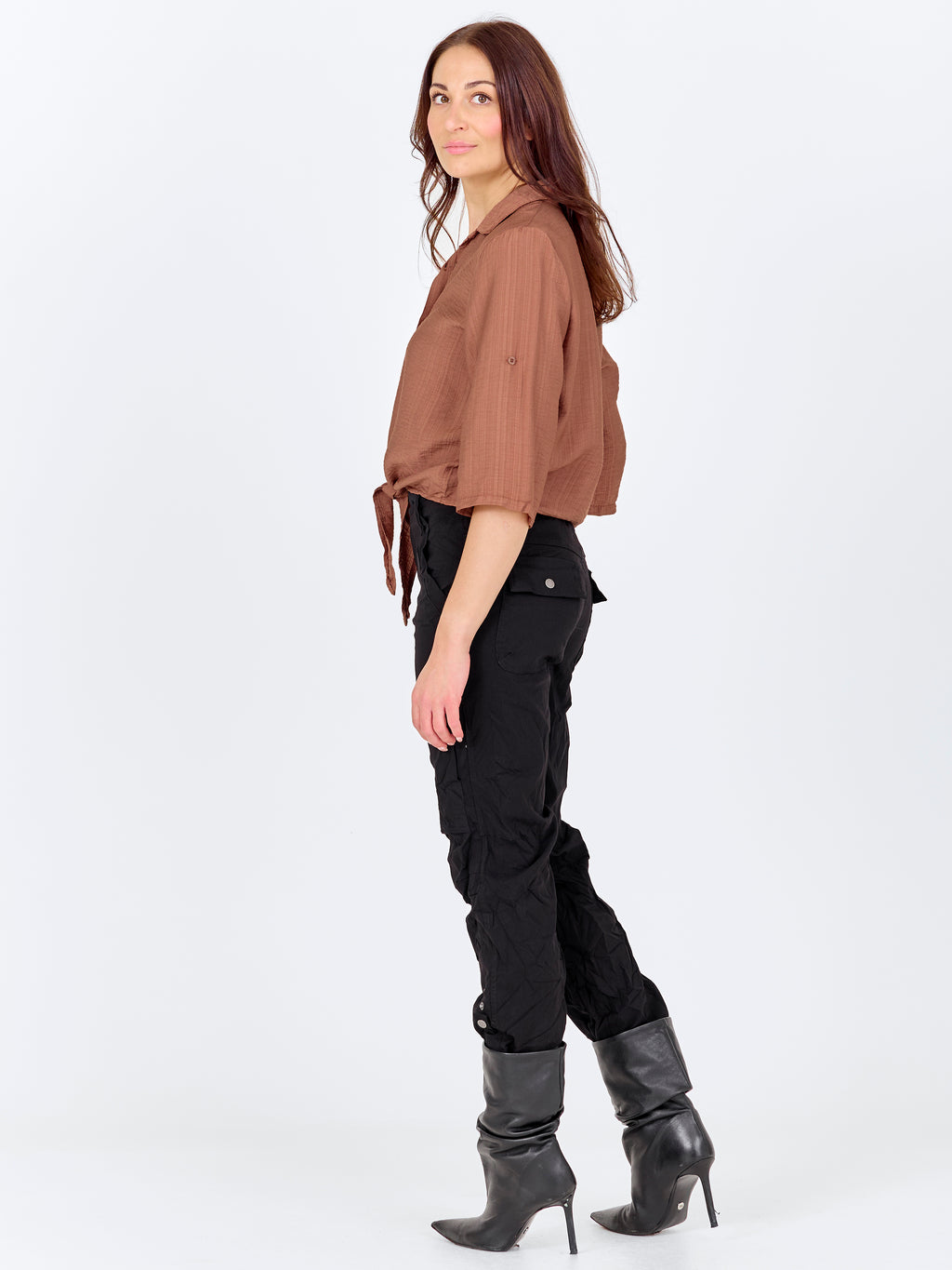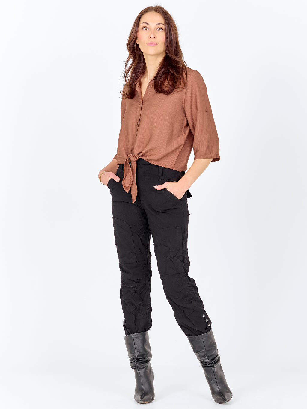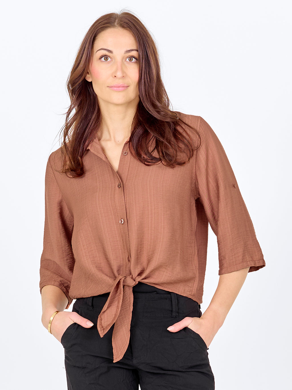 Denne skjorte har et let og afslappet udtryk med korte ærmer, der kan smøges op og fastgøres med strop. Fortil lukkes den med knapper og afsluttes med en dekorativ bindedetalje, som giver et feminint præg. Bagsiden er enkel og lige i snittet. Style skjorten med løse bukser, en nederdel eller shorts for et afslappet hverdagslook, eller brug den åben over en enkel top på varme dage.