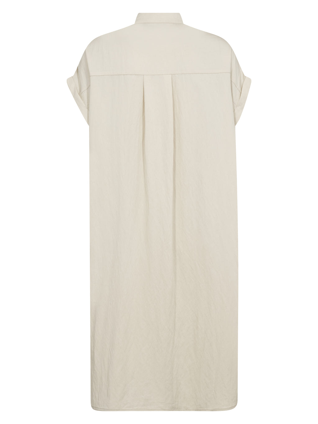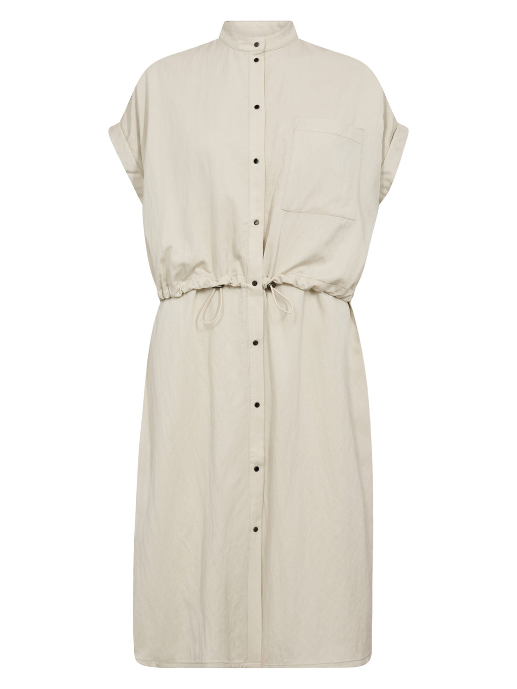 Denne kjole har et afslappet og enkelt udtryk med kort ærme og knaplukning hele vejen ned foran. Den høje krave giver et rent look, mens snøren i taljen kan justeres og skaber mulighed for at samle kjolen let ind. Foran har kjolen en brystlomme, og bagpå er designet mere enkelt med et lige fald. Kjolen kan styles både lukket som kjole eller let åben over bukser for et mere casual look.