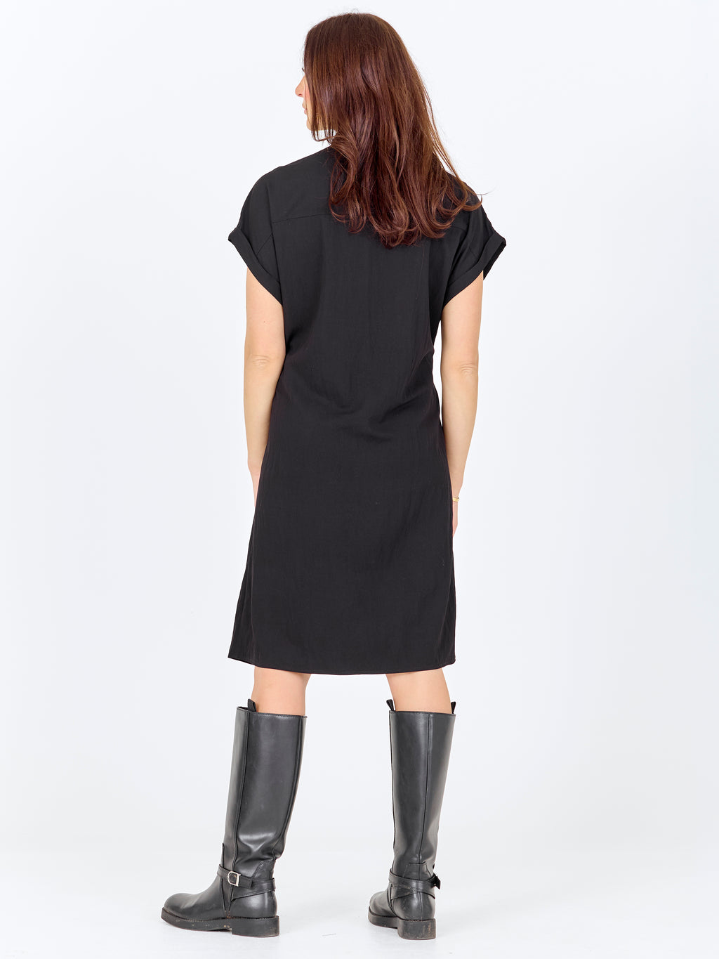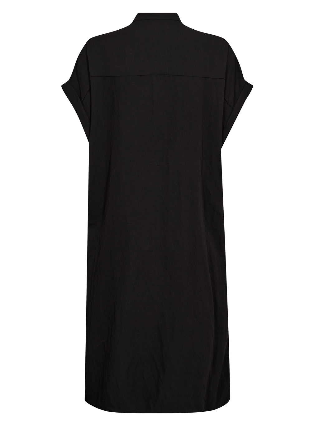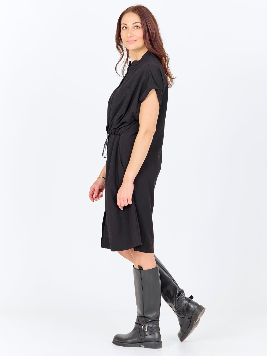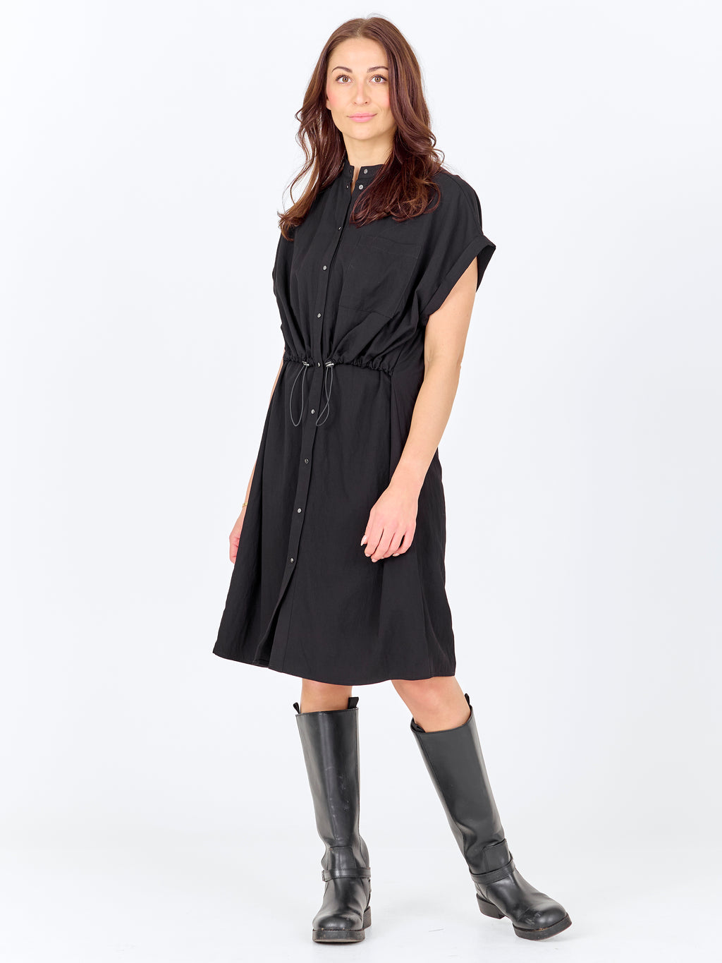 Denne kjole har et afslappet og enkelt udtryk med kort ærme og knaplukning hele vejen ned foran. Den høje krave giver et rent look, mens snøren i taljen kan justeres og skaber mulighed for at samle kjolen let ind. Foran har kjolen en brystlomme, og bagpå er designet mere enkelt med et lige fald. Kjolen kan styles både lukket som kjole eller let åben over bukser for et mere casual look.