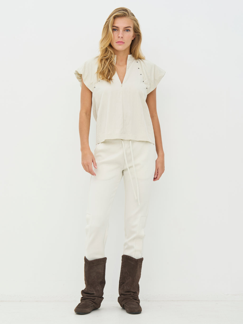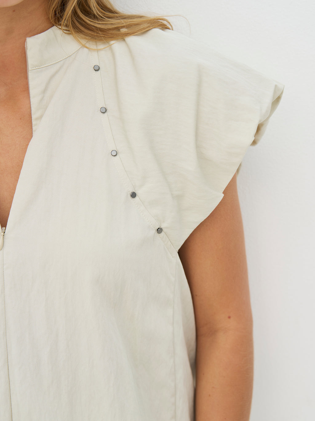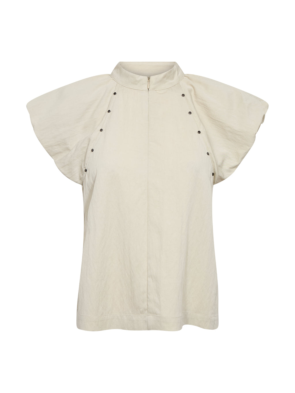 Denne top har et feminint udtryk med en blød, høj hals og korte ærmer med let vidde, som giver et fint fald over skuldrene. De små nitter langs ærmegabene tilføjer en diskret detalje, der bryder det enkle look uden at fylde for meget. Foran er designet rent og roligt, mens bagsiden falder løst og behageligt. Toppen er nem at style både til bukser og nederdele og fungerer godt til både hverdag og mere pæne anledninger.