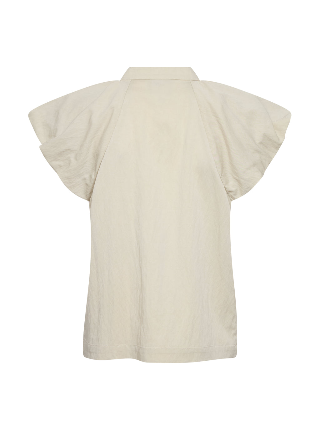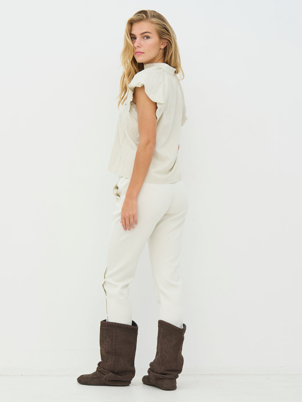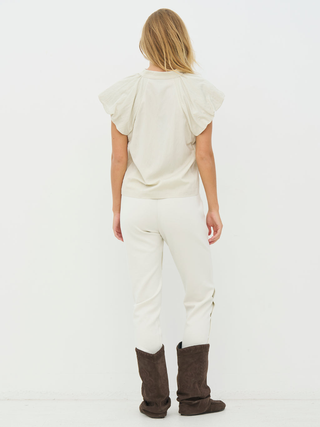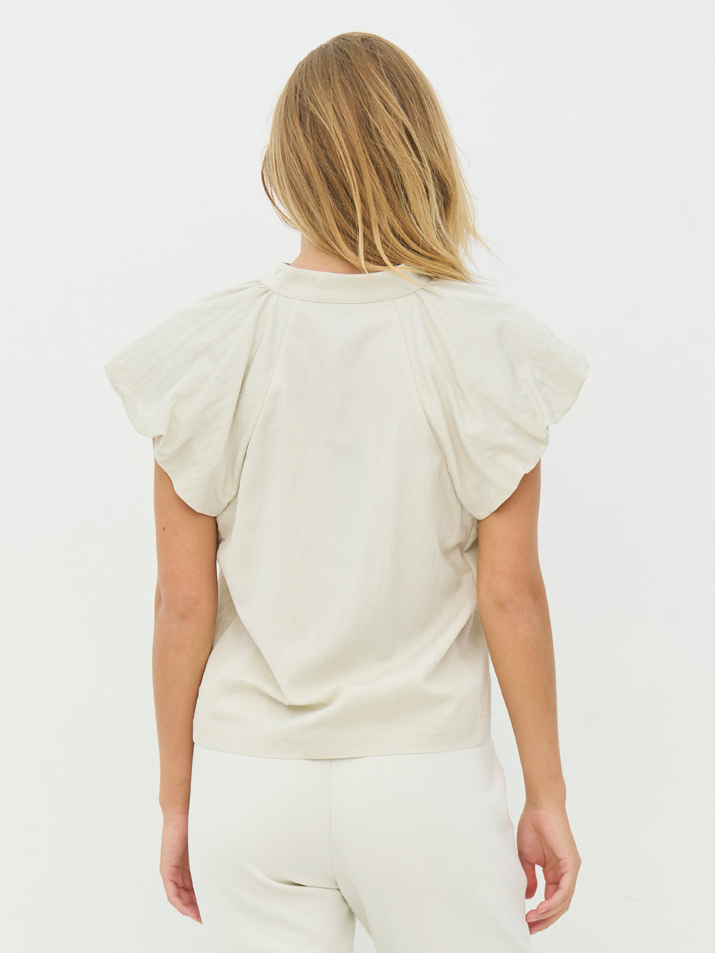 Denne top har et feminint udtryk med en blød, høj hals og korte ærmer med let vidde, som giver et fint fald over skuldrene. De små nitter langs ærmegabene tilføjer en diskret detalje, der bryder det enkle look uden at fylde for meget. Foran er designet rent og roligt, mens bagsiden falder løst og behageligt. Toppen er nem at style både til bukser og nederdele og fungerer godt til både hverdag og mere pæne anledninger.